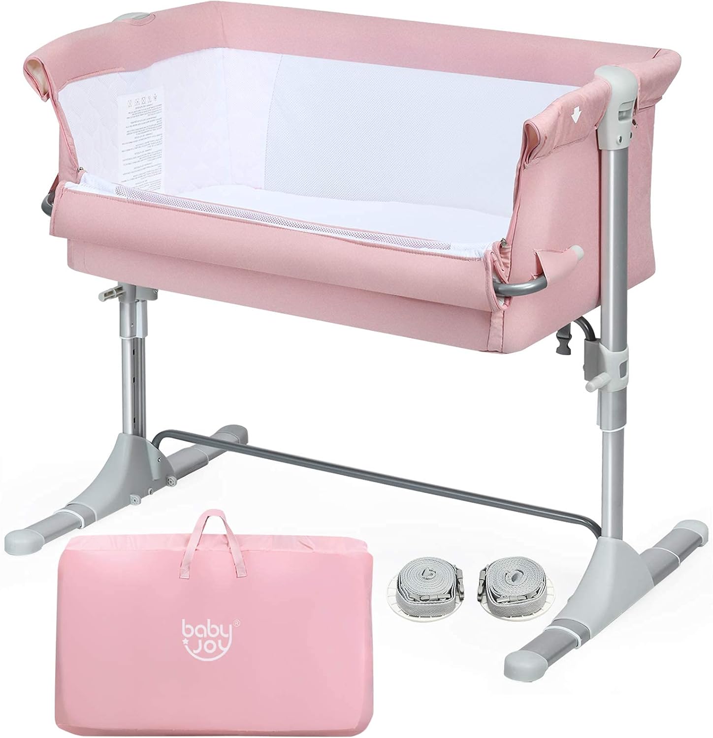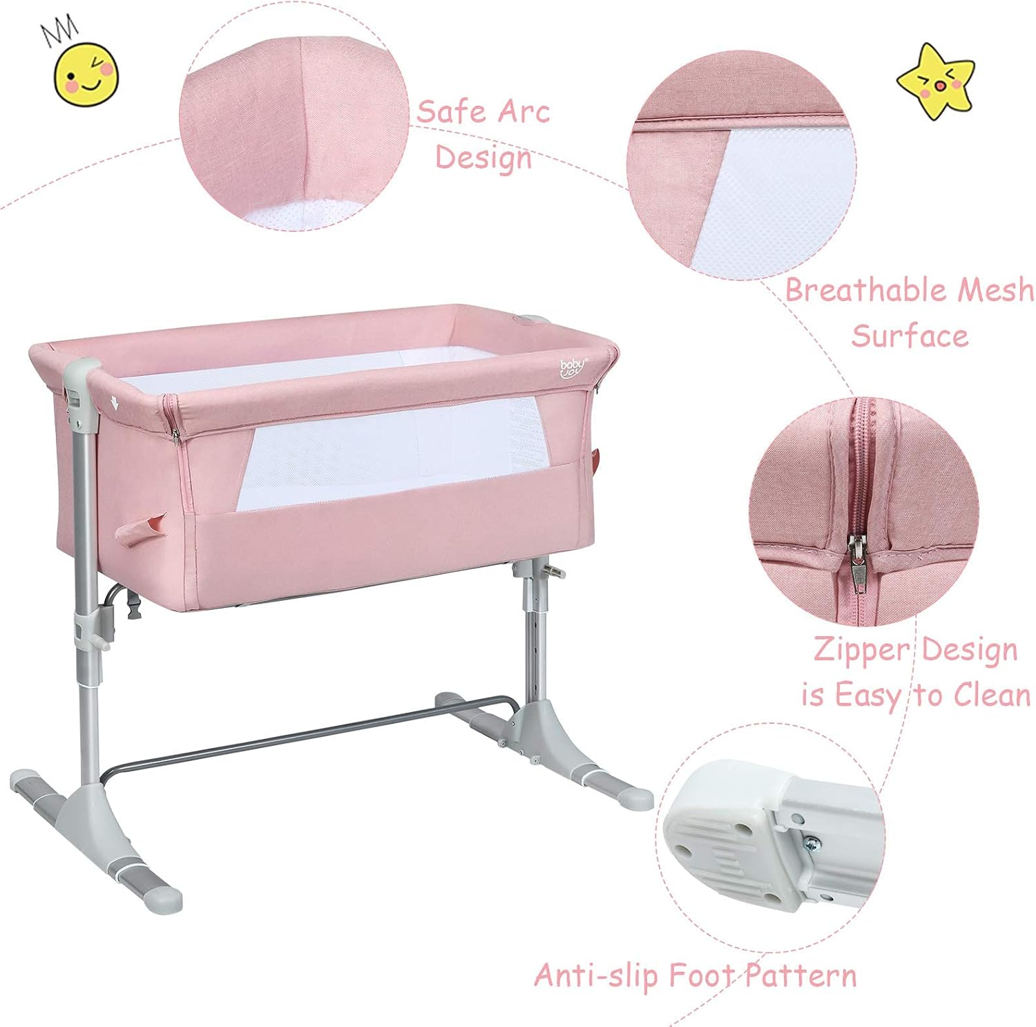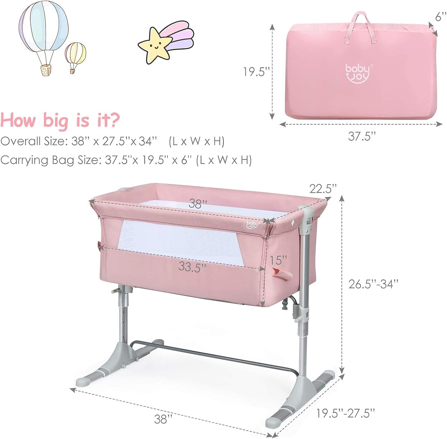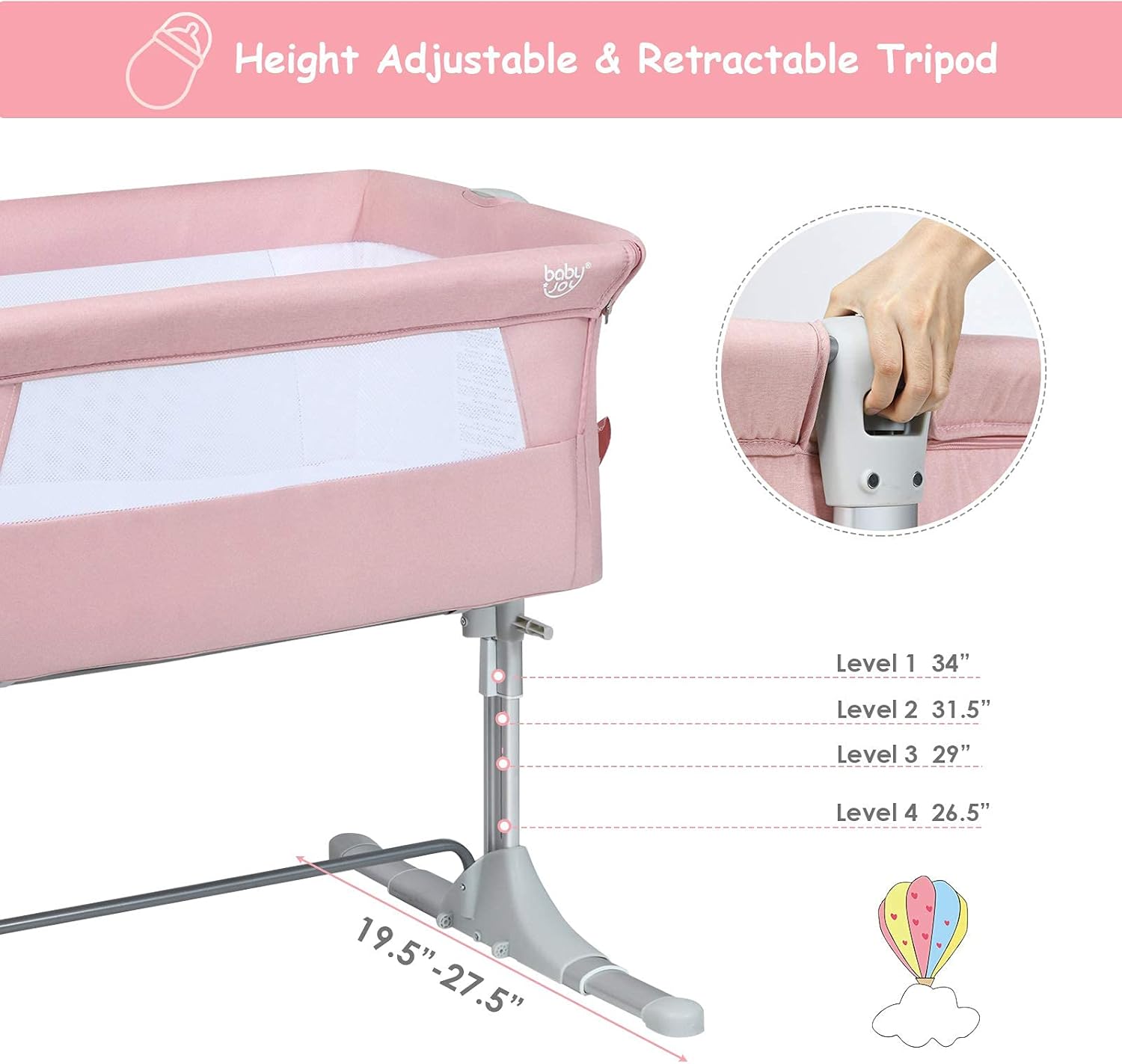 BABY JOY Baby Bedside Crib, Portable Travel Sleeper Bed Side Bassinet w/Carrying Bag, Newborn Bassinet to Infant, Kids Crib with Detachable Mattress, Height Adjustable Design, Breathable Mesh, Pink