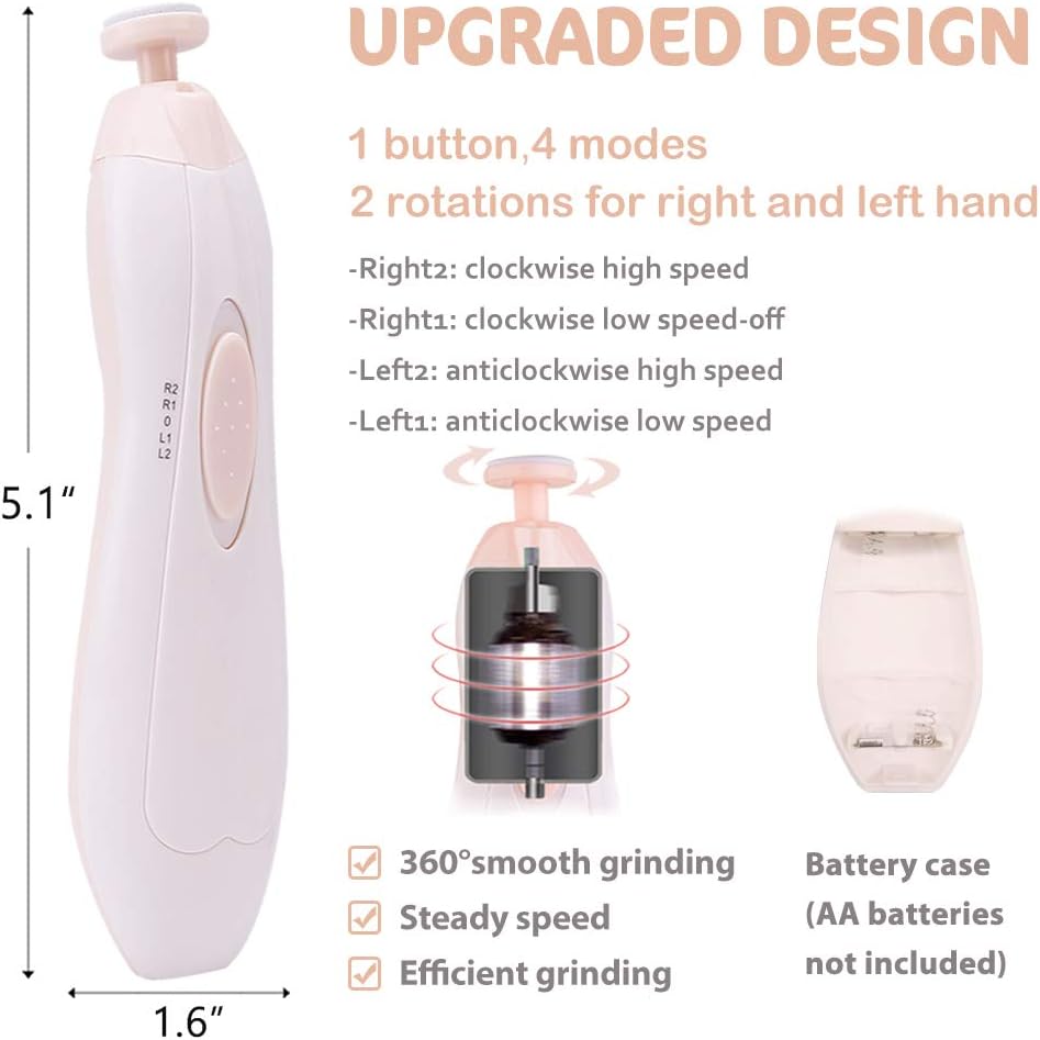 ONE-BUTTON AND ADJUSTABLE SPEED – The electric nail file for baby is super easy to use with only 1 button. You can simply operate the modes just by one hand: clockwise and counterclockwise rotation, high and low speed, switch off. The baby nail trimmer allows you to choose rotating direction and speed when trimming different hands’ fingernails. 360° all-round exquisite polishing makes toenails and fingernails softer and smoother