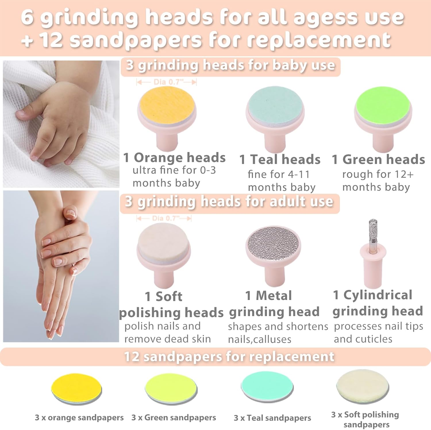 NAIL CARE KIT FOR BABIES AND ADULTS – Better than others, this baby nail file set includes 1 nail clipper, 6 grinding heads and 12 extra sandpapers. Colored sandpapers with 3 textures are designed for different stages of babies’ growth. Electric baby nail trimmer also comes with 1 cylindrical grinding head and 1 metal grinding head for adults, 1 soft grinding heads for polishing. The nail clippers can be used for newborn, infant, toddlers, kids from 0 to 12 months or above, as well as adults