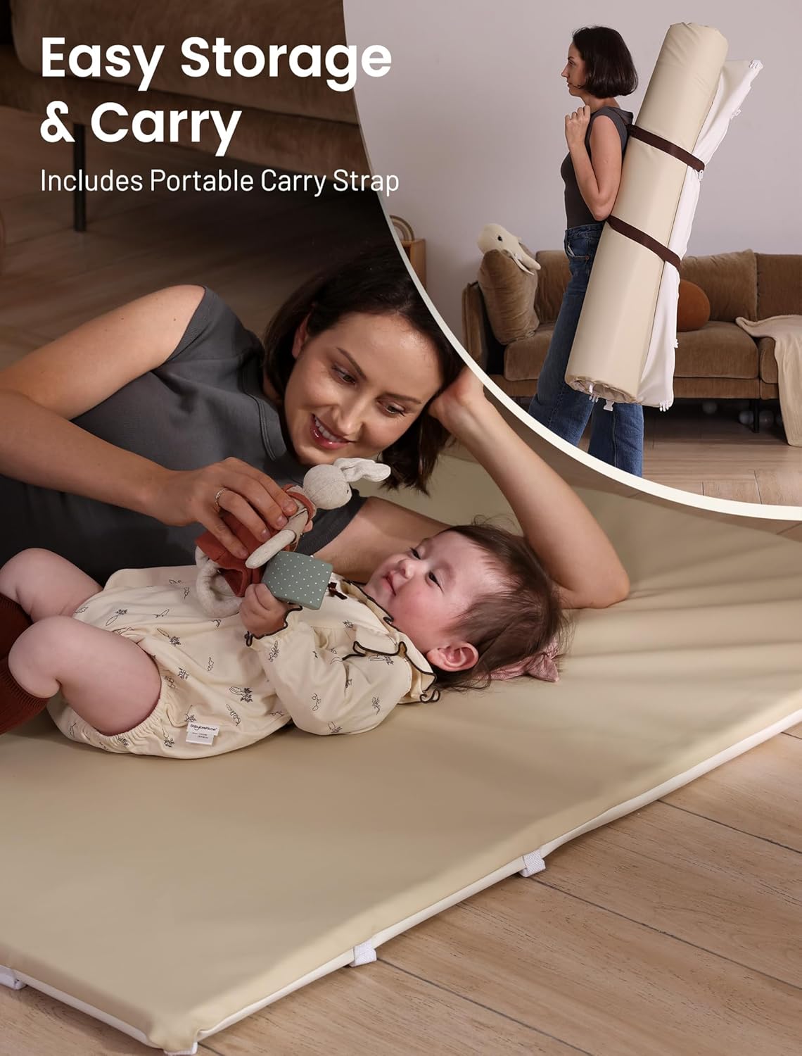 PORTABLE & DURABLE:This foam play mat is one-piece compact with fold-and-go design, easy to carry and store. When go to backyard or outdoor activities, you can roll it up with the tie in the package and take it away with you and your babies. Crafted from anti-scratch PU material, this baby gym mat is built to endure a long time using. It always accompany your baby through every step of growth,from rolling over,crawing to stepping and outdoor trips.