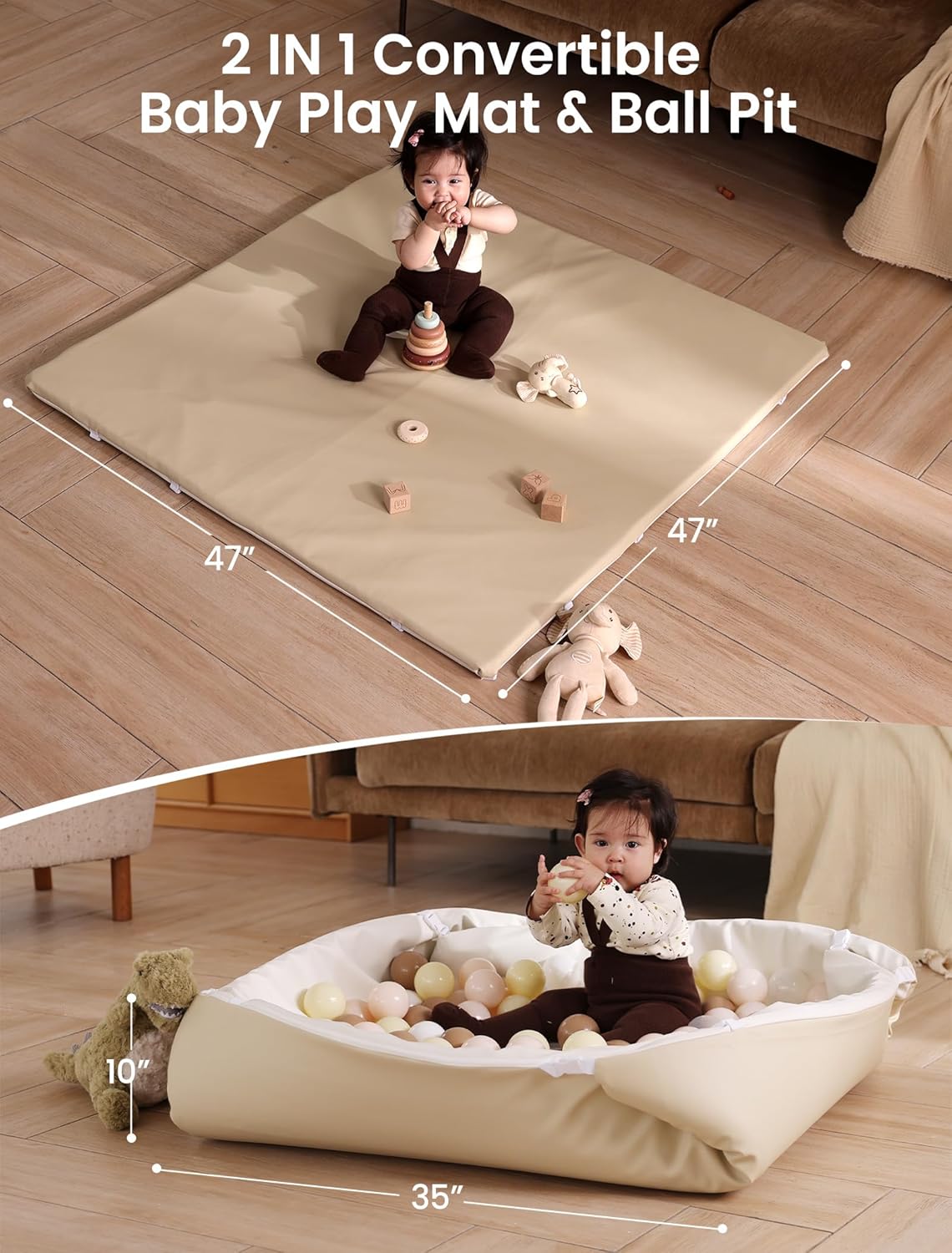 Baby Play Mat for Floor: 2-in-1 Foldable Foam Mat & Ball Pit – 1.2inch Thick Vegan Leather Padded Floor Mat – 47×47 Waterproof Playmat – fits 50×50 Playpen for Infants Baby Girls Boys