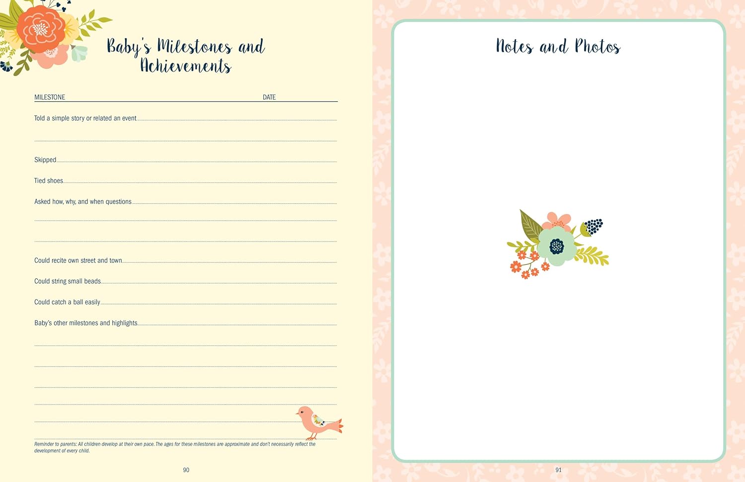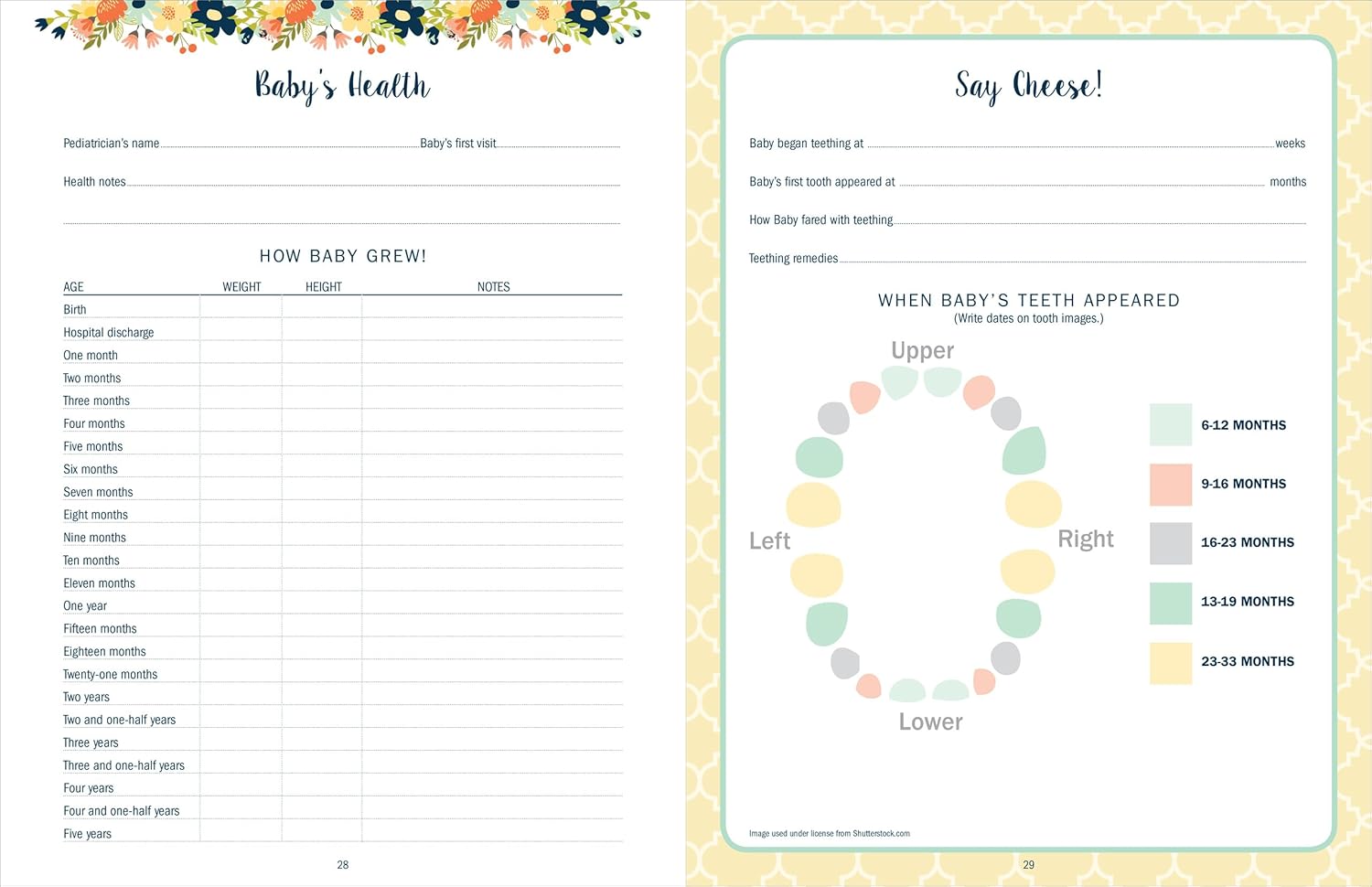 Includes pages to record Baby’s monthly progress for the first year, as well as yearly pages for ages one to five, and much more.
