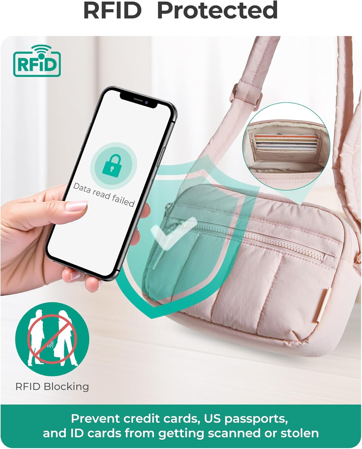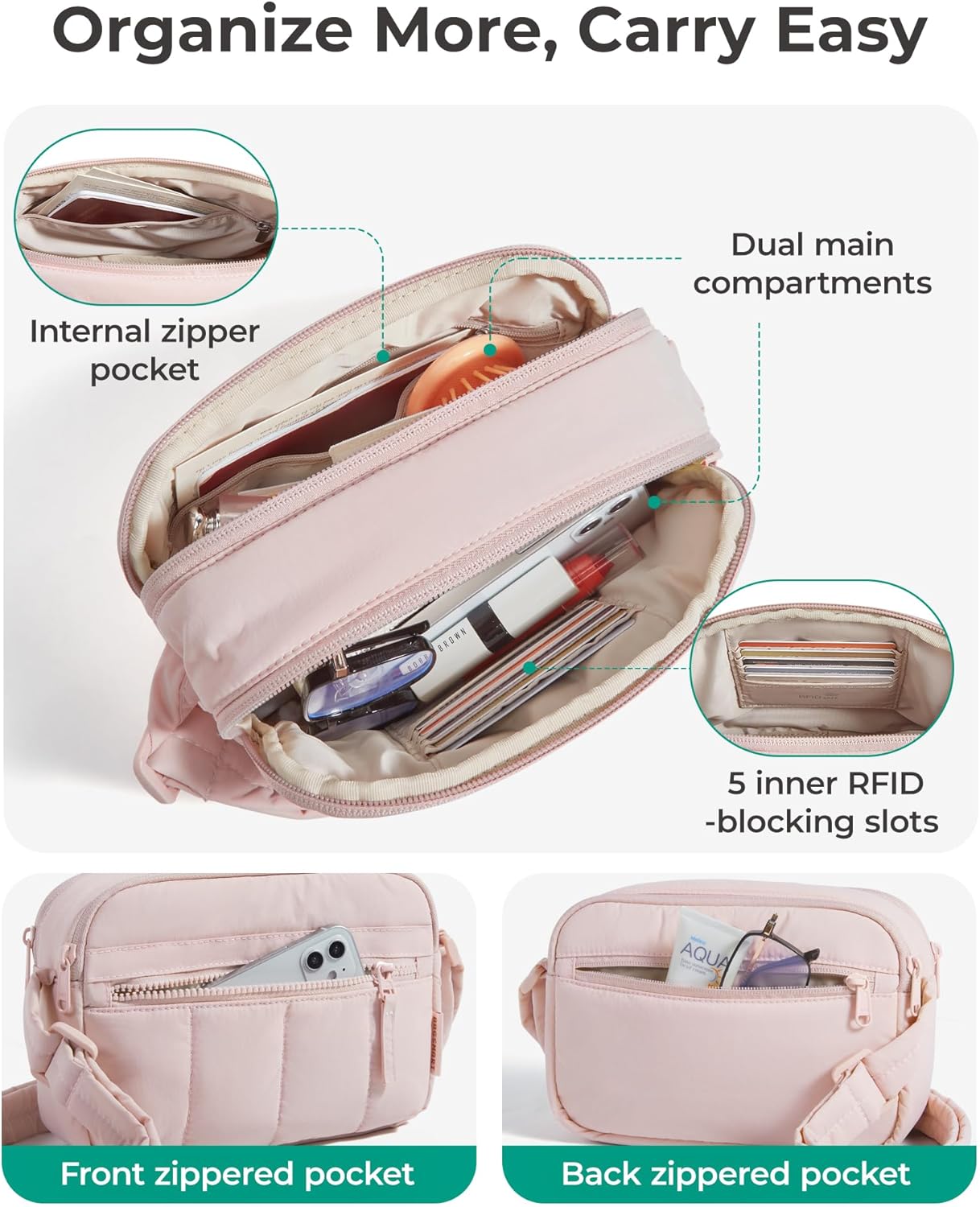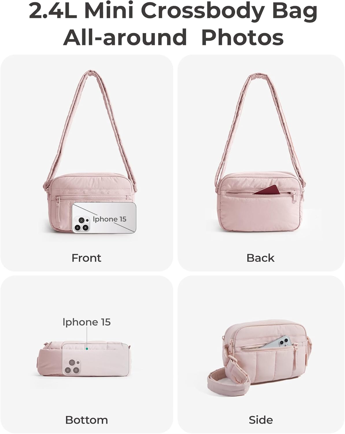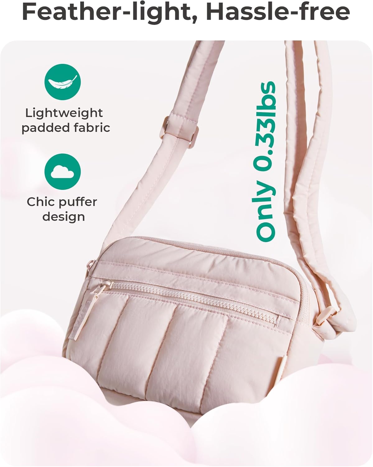 Material & Size: Lightweight & water-resistant puffy crossbody bag (just 0.33lbs)! Compact size 8.7”x2.8”x6.1” with 2.4L capacity – perfect daily essentials