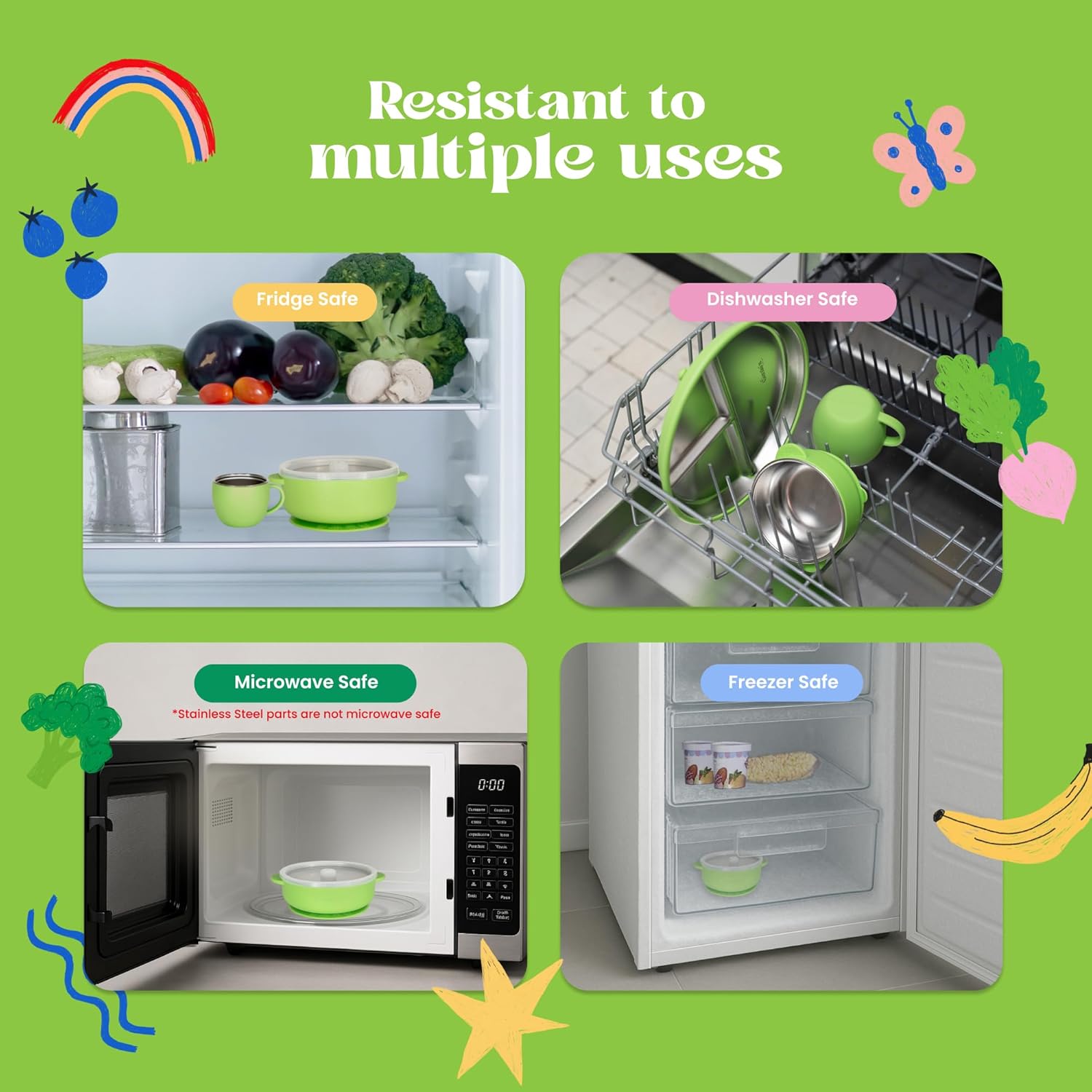 DURABLE AND EASY TO CLEAN: All parts are dishwasher, fridge, freezer and oven safe. Stainless steel retains food temperature longer than plastic alternatives. All parts of this kids stainless steel set are detachable for effortless cleaning
