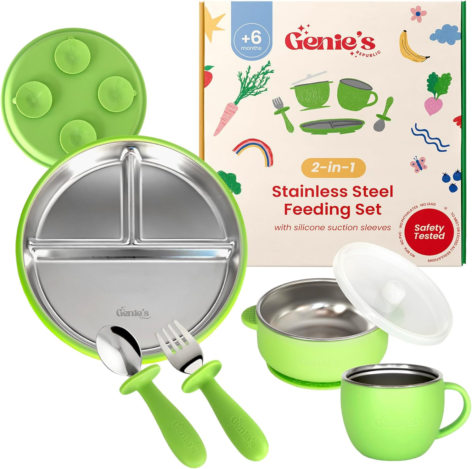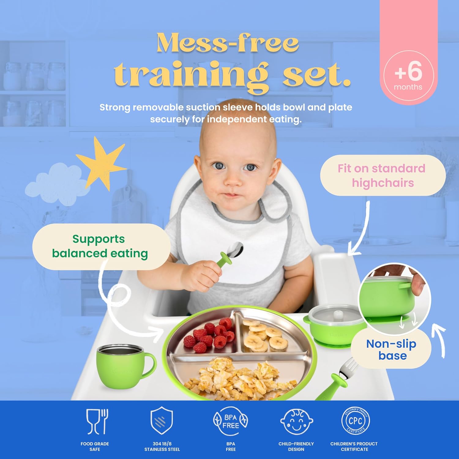 VERSATILE 2-in-1 BABY FEEDING SET: Stainless steel plate and bowl with airtight lid, cup, fork and spoon with removable silicone sleeves for suction and heat protection. Supports self-feeding.