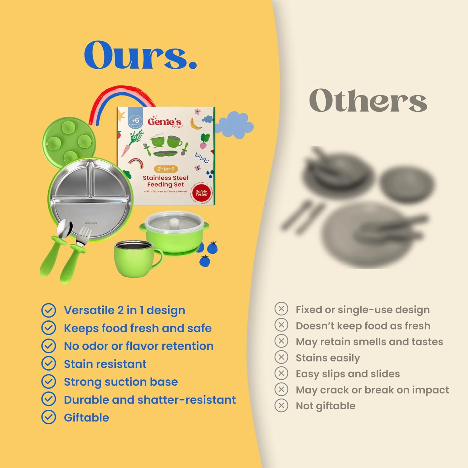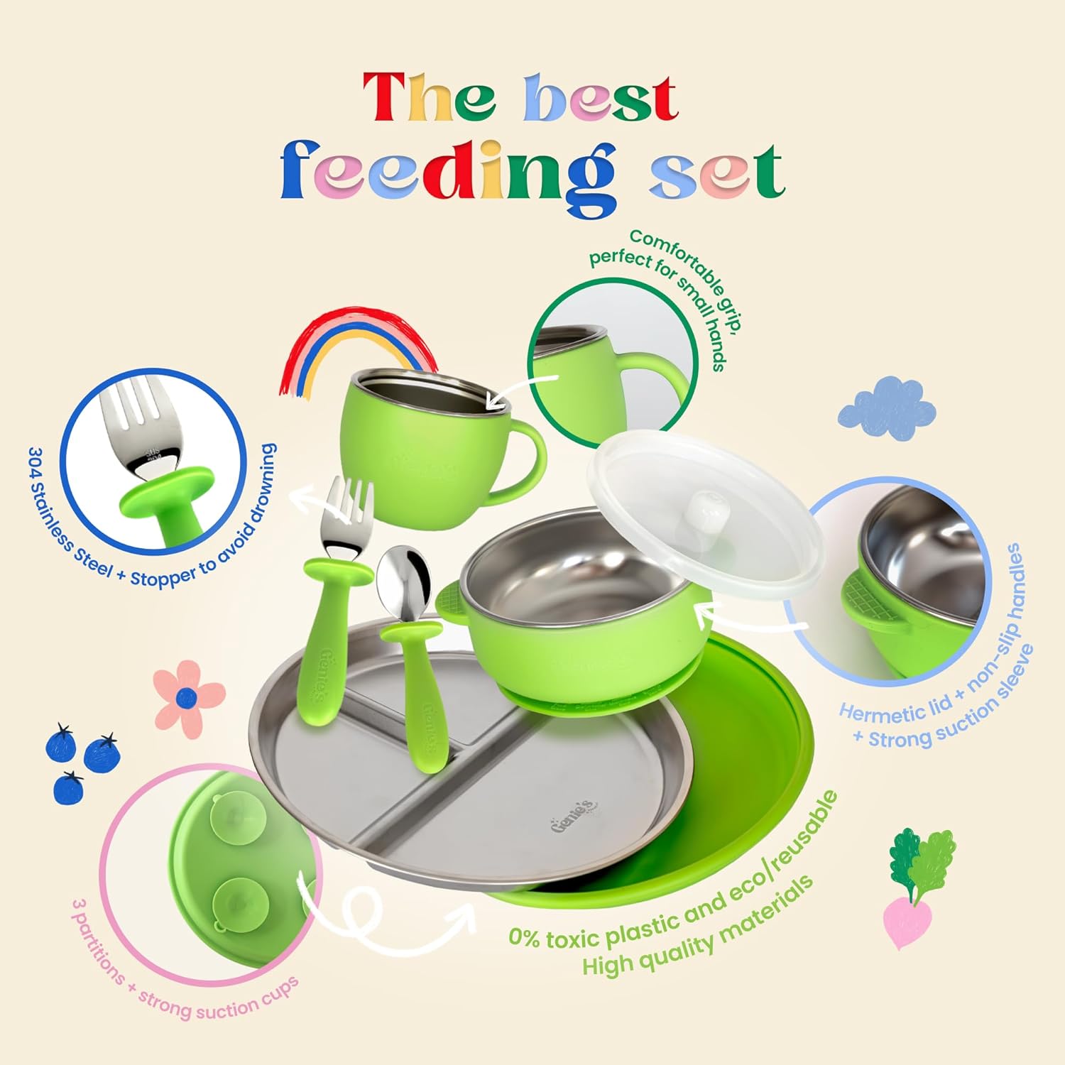 MESS-FREE SUCTION DINNERWARE: Strong silicone suction sleeves keep plates and bowls steady on tables or high chairs, reducing spills and frustration for toddlers learning to self-feed. The bento-style layout on our stainless steel plate encourages balanced portions and reduces overwhelm.