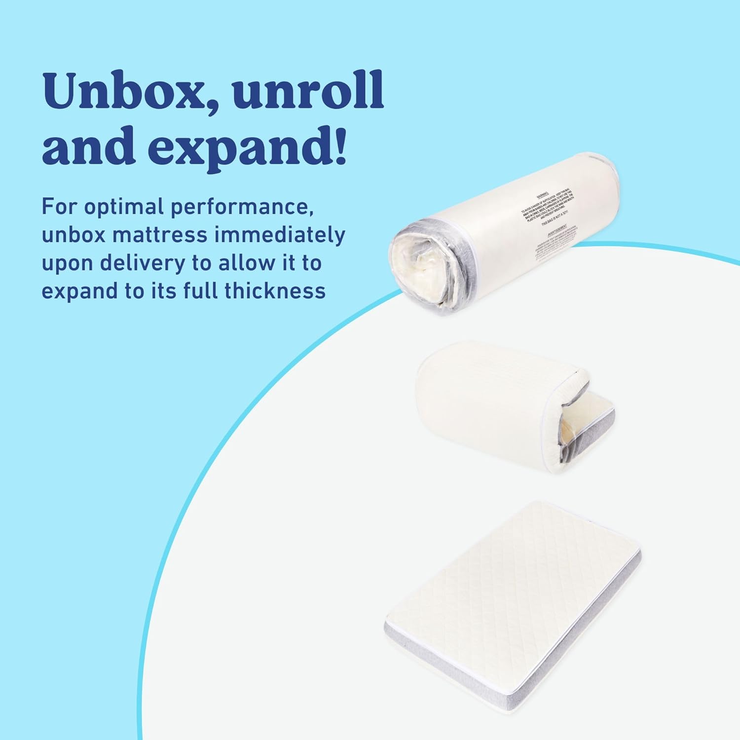 DUAL-SIDED CRIB MATTRESS IN A BOX: Free of fiberglass, free of chemical flame retardants; Fits any brand of standard full-size crib and toddler bed; Allow baby crib mattress to expand fully immediately upon delivery in a room temperature setting for up to 48 hours