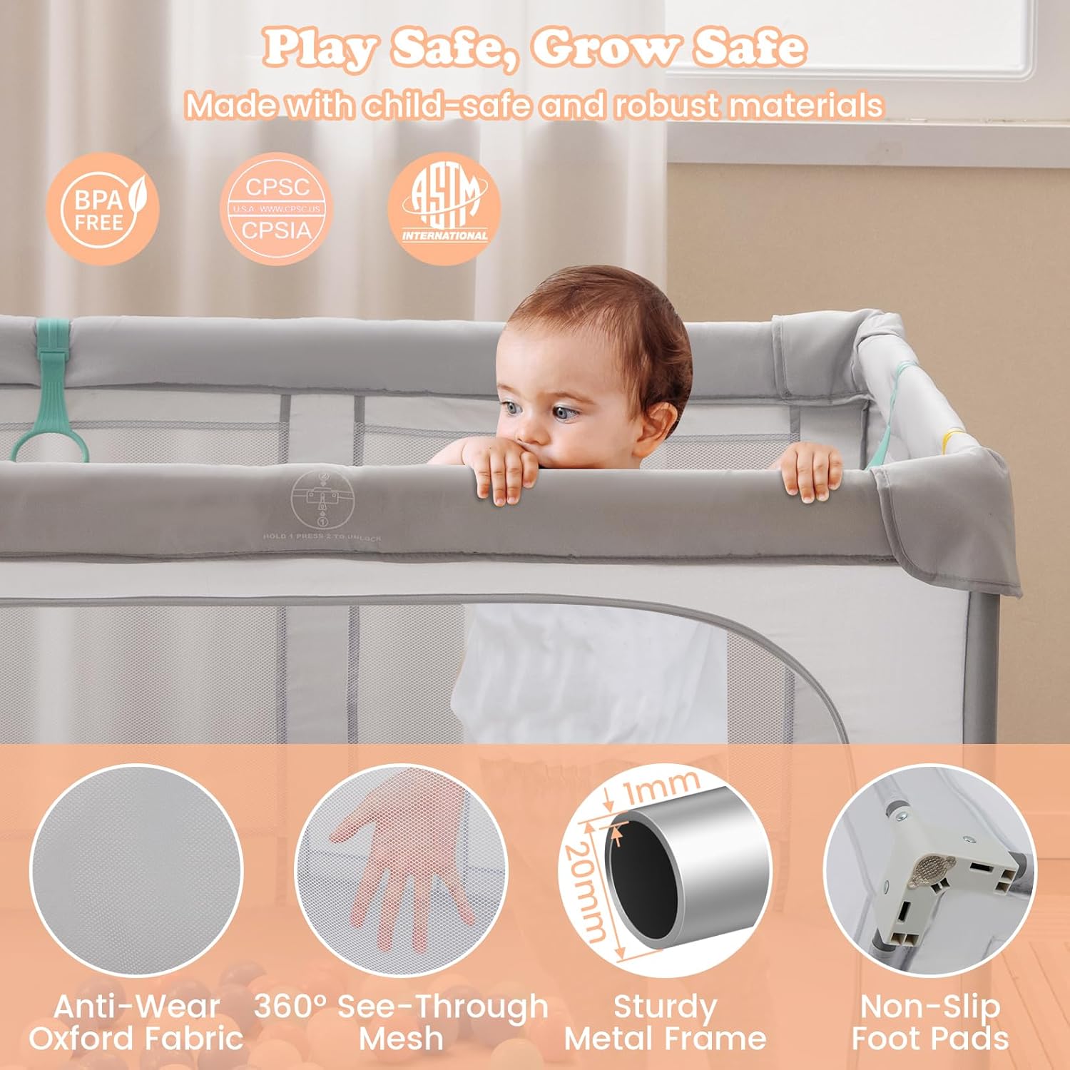 Safe & Robust Materials: The sturdy metal frame (tube thickness 1 mm) makes it a long-lasting addition to your child’s playtime essentials. Plus, the anti-wear Oxford fabric is also BPA-free, and 360° see-through mesh cloth allows parents to interact with the little ones at anytime, giving the baby enough sense of security.