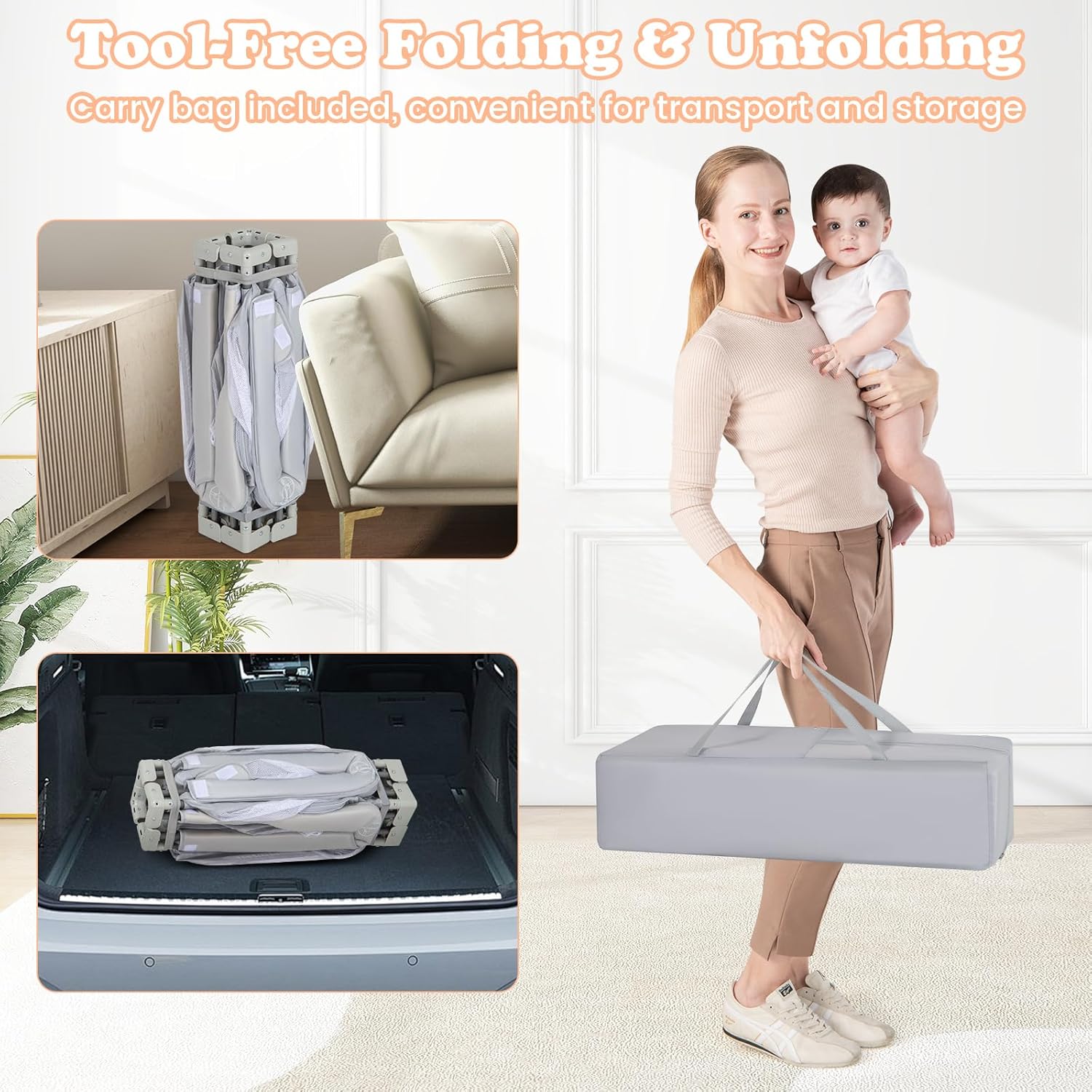 Foldable & Portable Design: No assembly needed when you receive this playpen for babies and toddlers. You can easily set up or fold the baby gate playpen. It comes with a carry bag for easy transportation and storage. Whether at home, or at a picnic, this versatile baby fence is your go-to solution for safe and contained play.