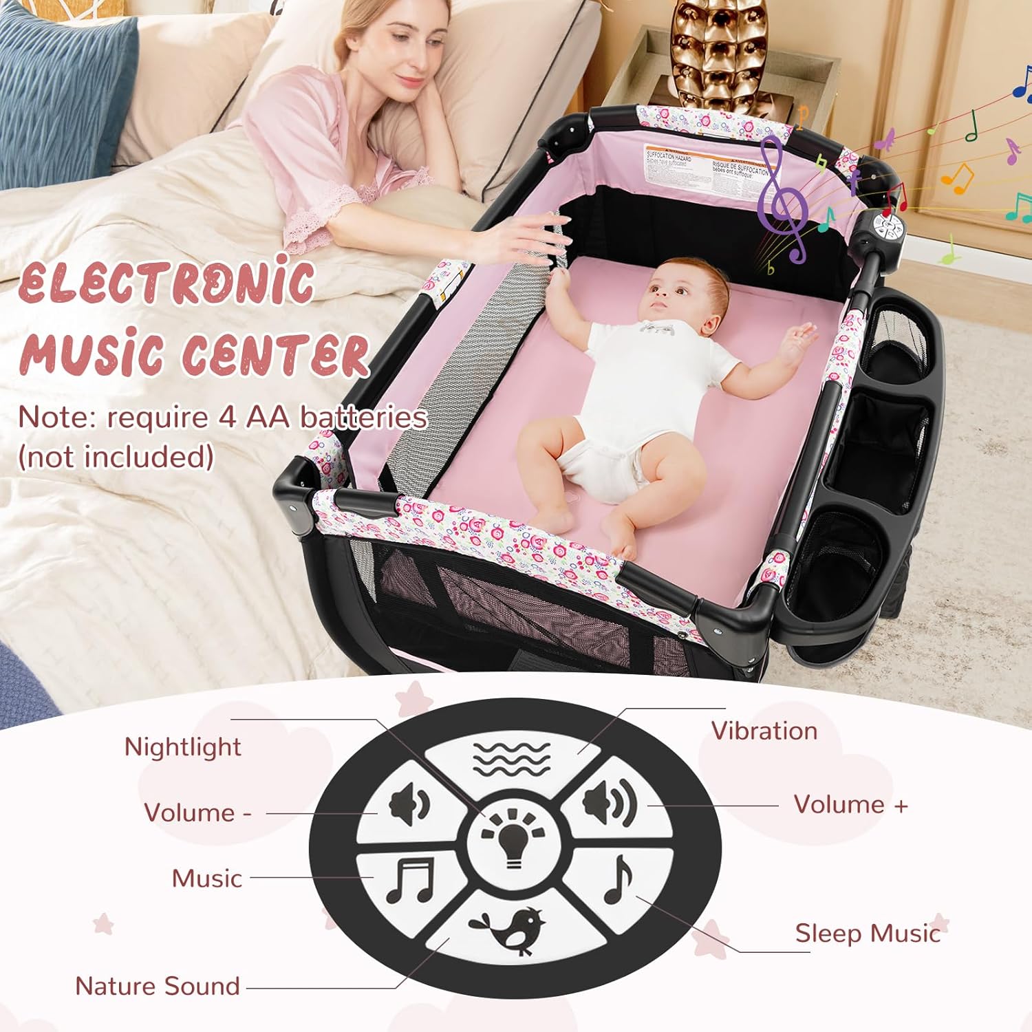 【Hanging Toys & Music Box】: The cute hanging toys can attract your baby’s attention, which encourages your baby to practice grasping ability. The music box features nightlight, music, natural sound, sleep mode and vibration function, and the volume level is adjustable as you like. Note: require 4 AA batteries (not included).