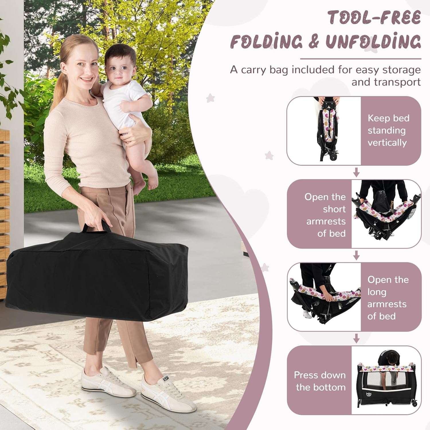 【Tool-Free Assembly & Certified Safety】The assembly requires no tool and the process is easy and quick following the included detailed instructions. The breathable mesh cloth offers better air circulation and the Oxford fabric is skin-friendly and wear resistant. Our baby nursery center complies with ASTM standard, ensuring high quality and reliable safety.