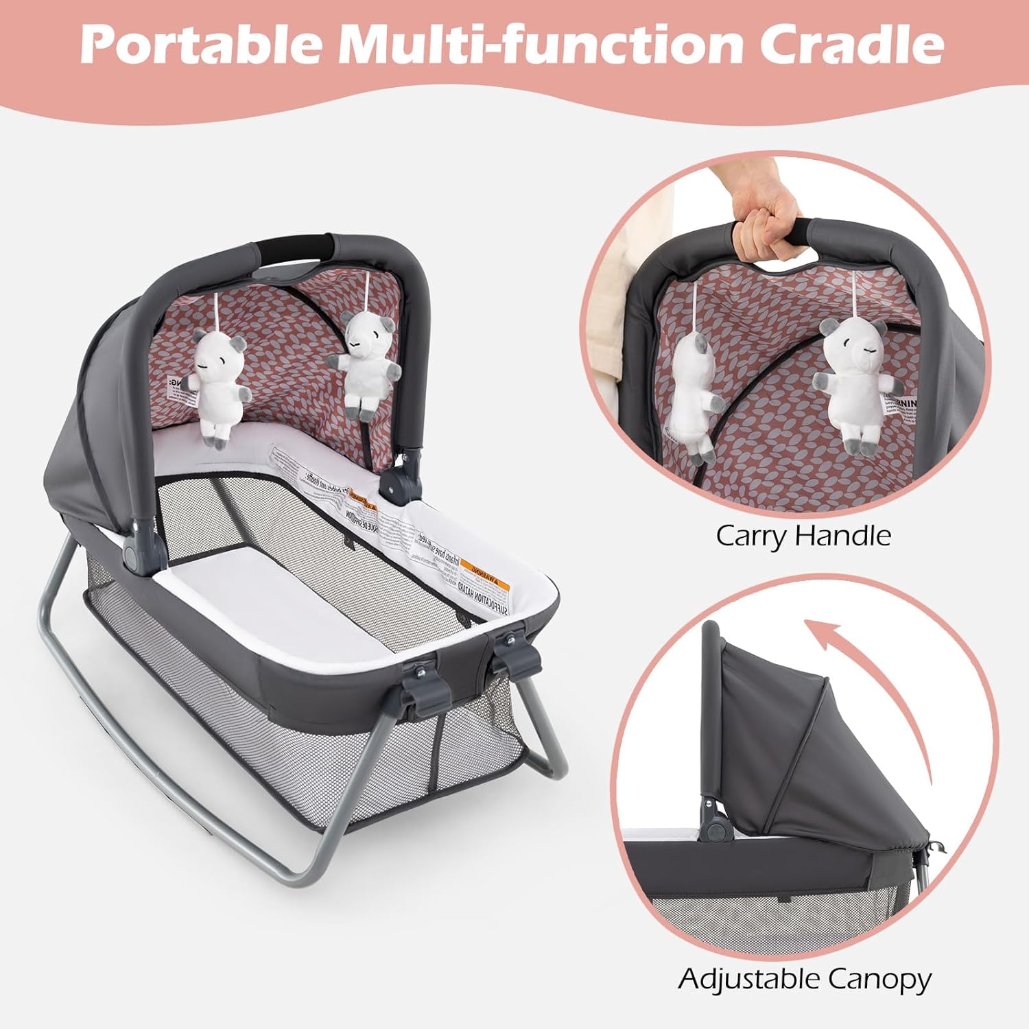 INFANS baby nursery central is the perfect solution for new parents. It features two removable Rock-A-Bye cradles and diaper stations side by side, with its own canopy to protect it from direct light. Also the baby bassinet is equipped with a music box and hanging toys, your baby will enjoy the comfort of a cradle and the ambiance of musical lighting. 2 lockable wheels make it possible to move from place to place. The portable crib easily folded into a convenient travel tote bag, is the best choice for families traveling with babies.
