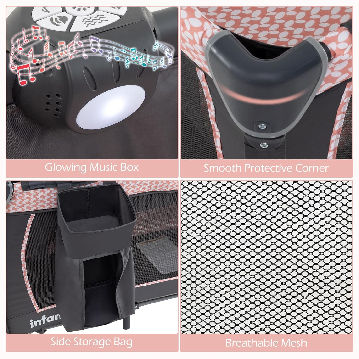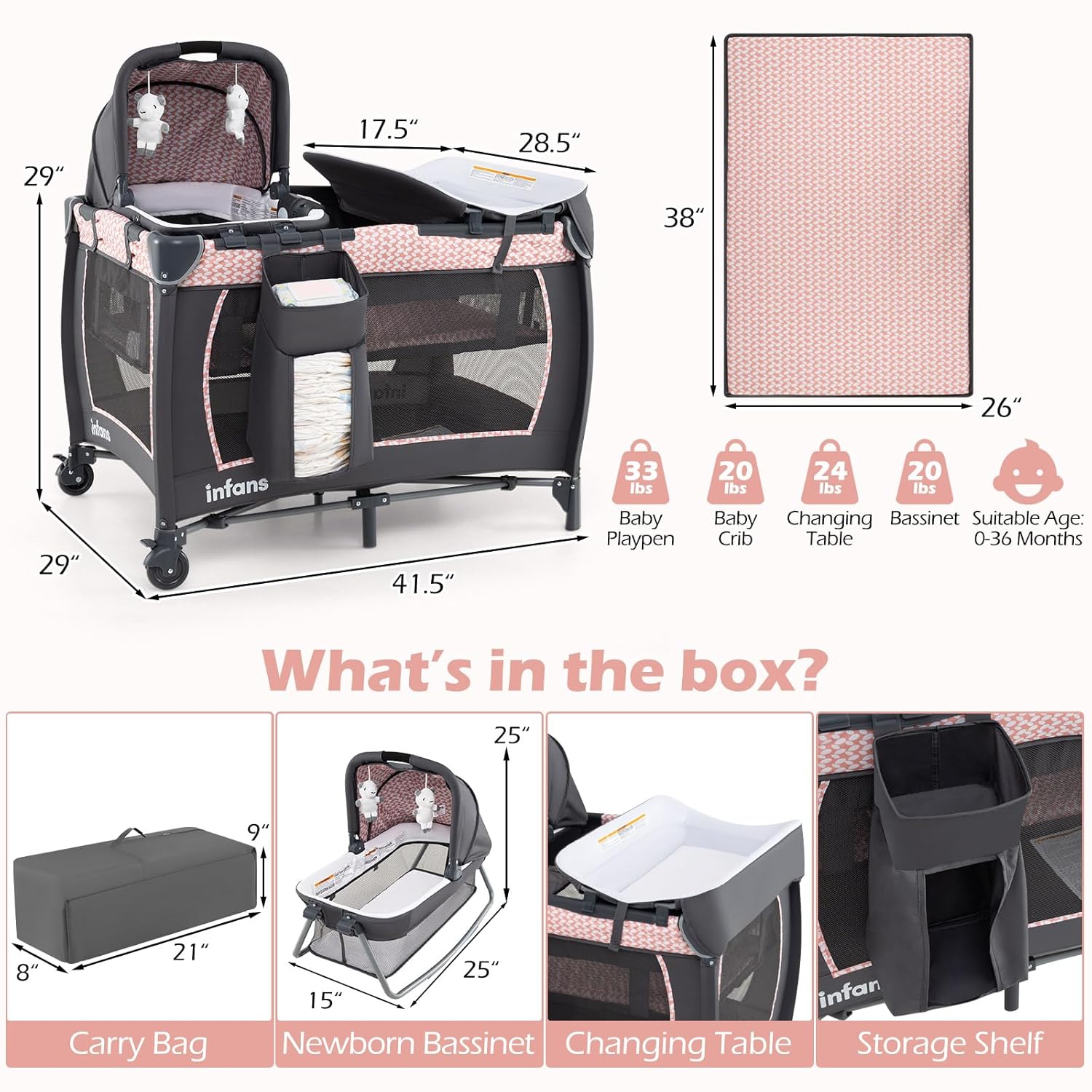 Multi-functional Baby Playpen: INFANS 4 in 1 pack and play will accompany your baby to grow up, featuring a removable changing table, bassinet, spacious playpen and cradle. The storage basket can be used to store your baby’s daily necessities.