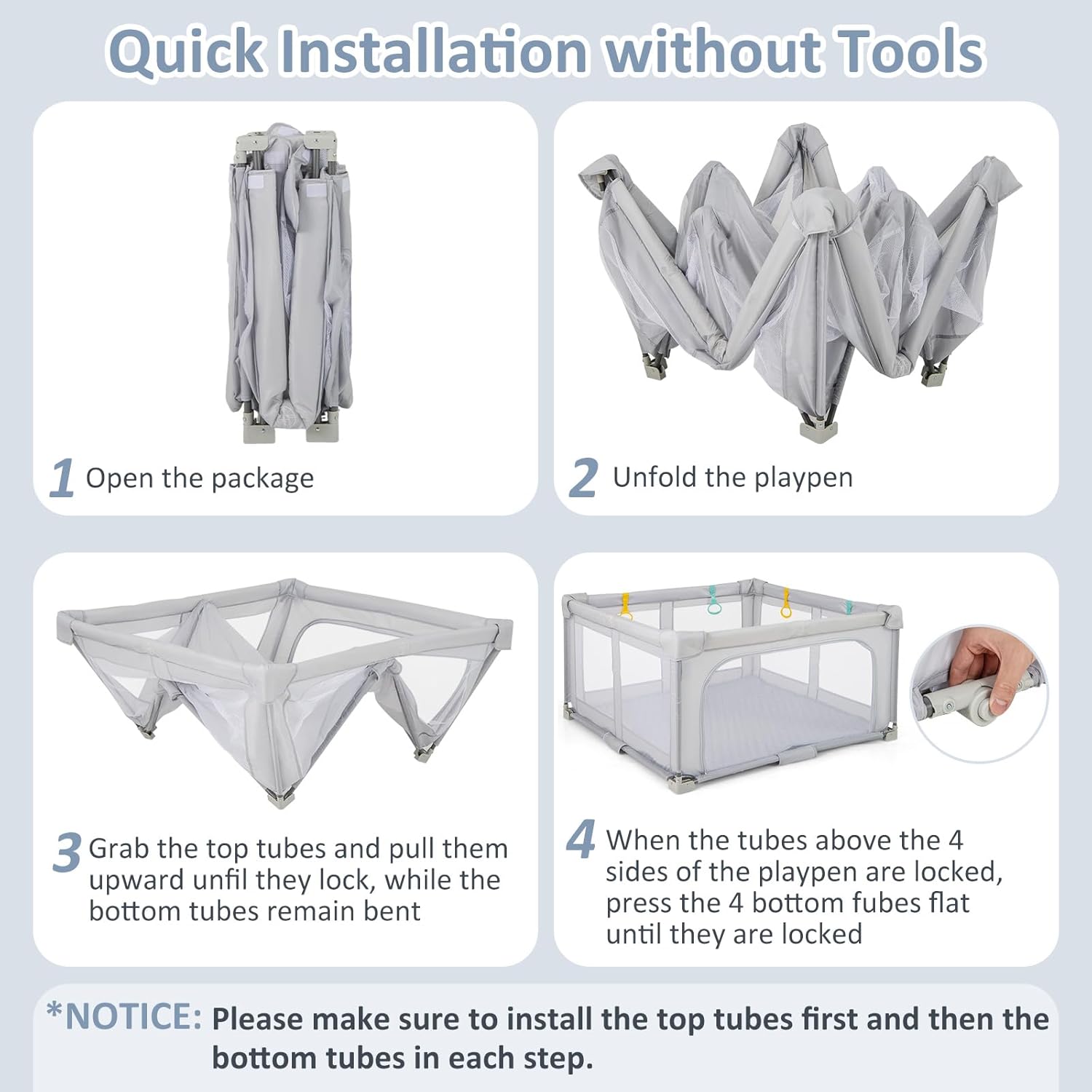 Safety Play Space: The baby fence is made of non-toxic and odorless safe Oxford fabric, free of BPA, so parent don’t have to worry about baby biting it, ensuring the safety of baby. The baby play yard features firm metal pipes and upgraded reinforced connections that ensure the fence is not easily bent. The bottom of the fence is equipped with non-slip pads for enhanced stability. Additionally, the playpen is tightly connected without gaps, and the edges are lined with thicker sponge and soft fabric to ensure children can play safely
