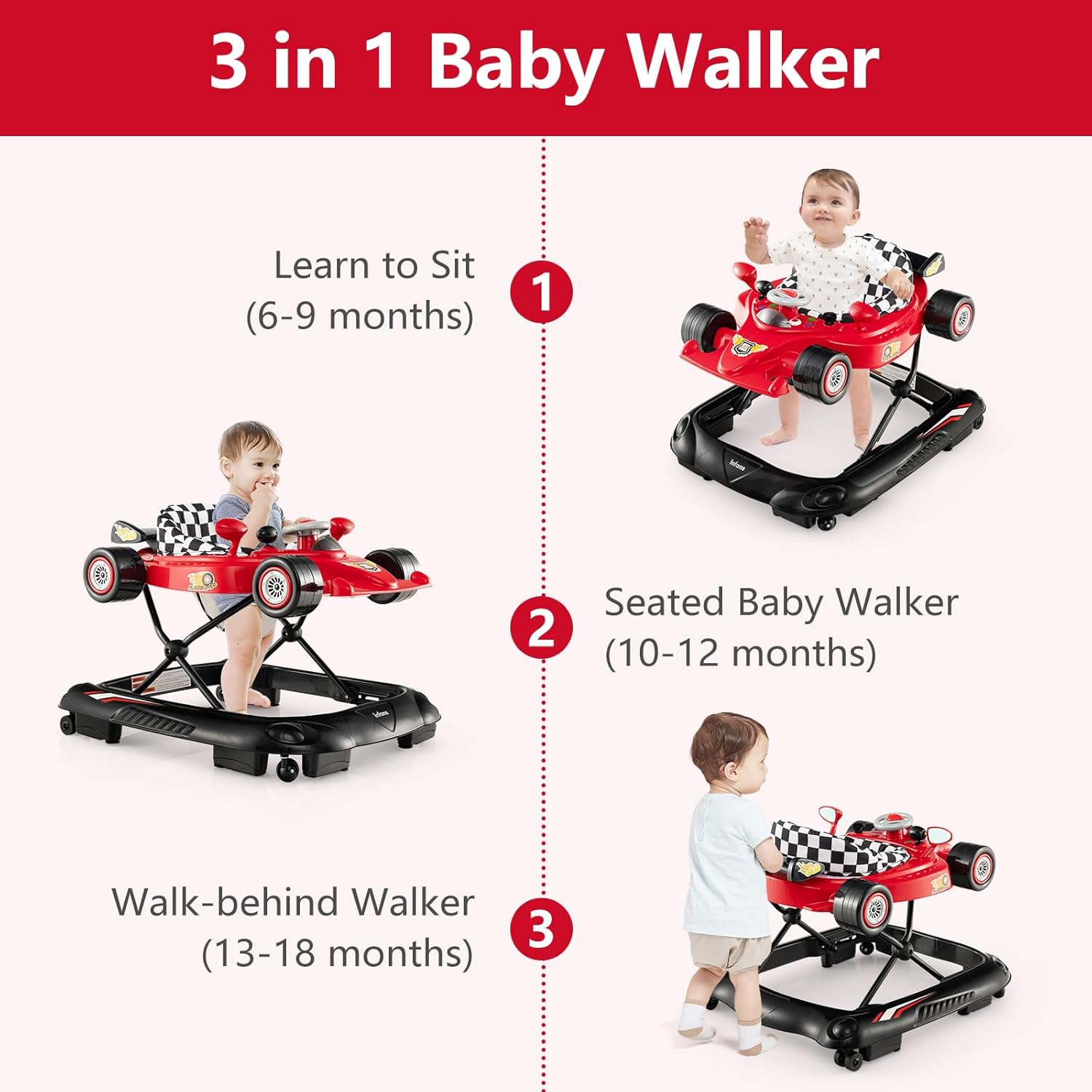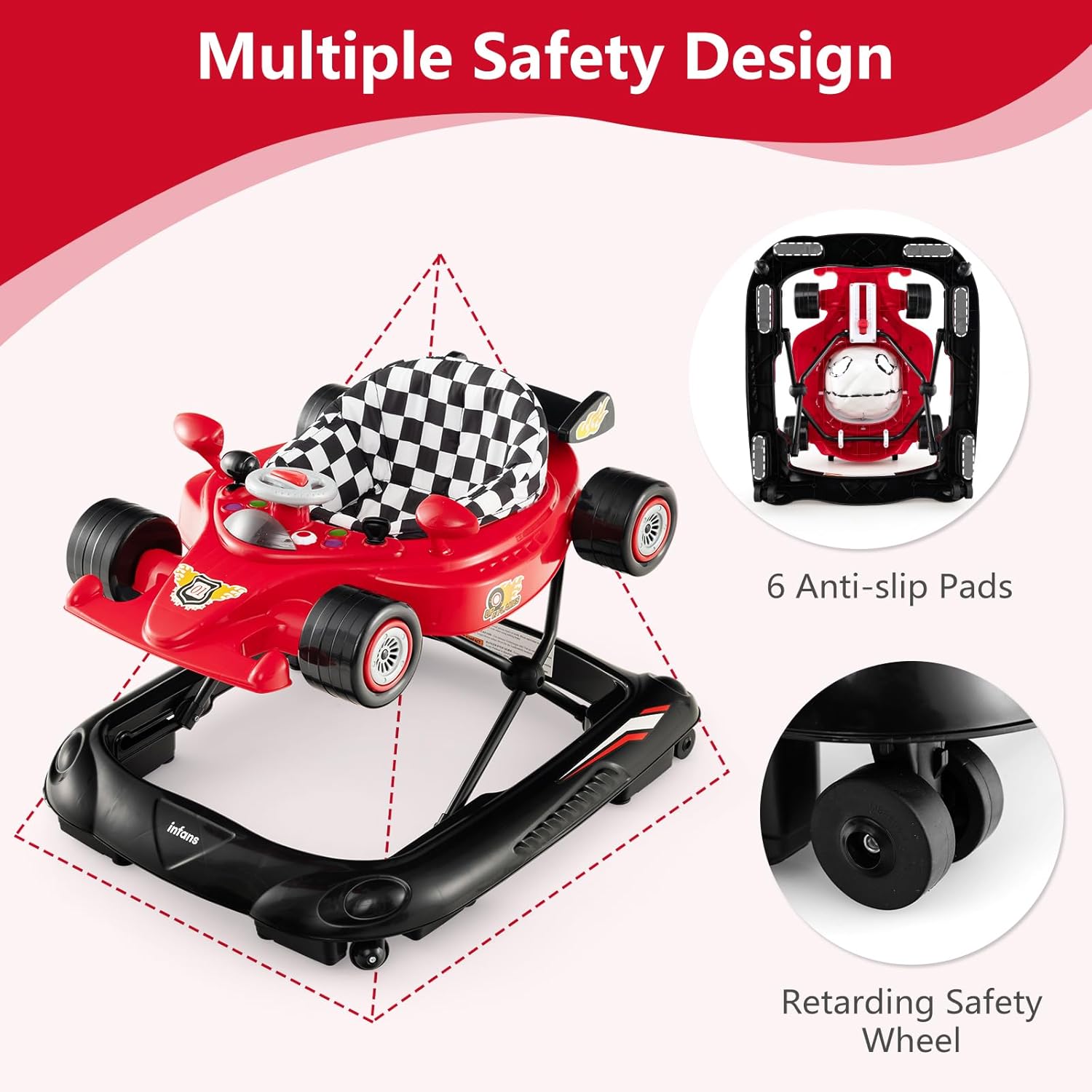 INFANS Foldable Baby Walker, 3 in 1 Toddler Activity Center Leaning-Seated Walk-Behind with Steering Wheel, Adjustable Height, Lights, Music, Washable Seat Cushion (Cherry)