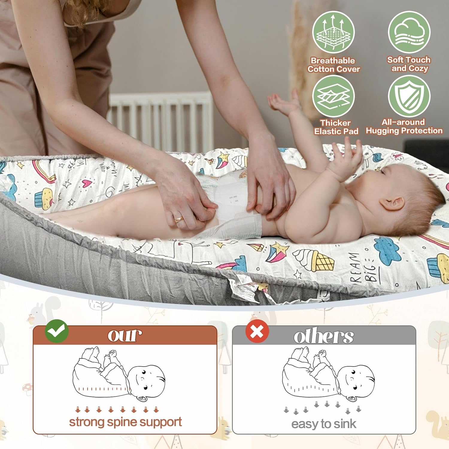 【Lightweight and Convenient “mobile baby bed”】The portable infant bed pad measures approximately 33.1*19.7 inches, 4.3 inches thick and weighs only 22oz (0.6kg), foldable and easy to carry, the baby lounger cover can be used as portable changing pad, travel bed, baby changing basket pad, baby gym & playmat, playard bedding and more are essential for baby on the go. Mum can use our portable baby lounger with confidence and it also makes the perfect shower gift or Christmas gift for new mums.