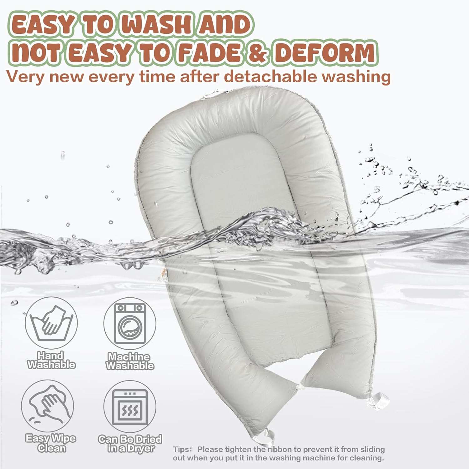 【Faux Womb Lounger, Growing Design】 The baby bed cover uses the American bionic concept to mimic the warmth of a mother’s womb, and the wraparound compact space of the baby bed cover gives your baby a full sense of security. With a removable U-shaped cushion, the buttons on the U-shaped cushion can be adjusted as baby grows to change the size of the cot. Suitable for babies from 0-12 months.