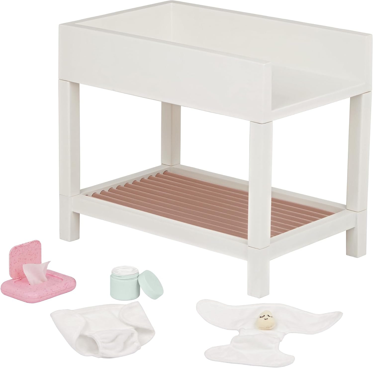 Includes: Changing table, a baby wipes container, a jar of pretend diaper cream, and 2 whimsical diapers with mini plushies inside for extra giggles.