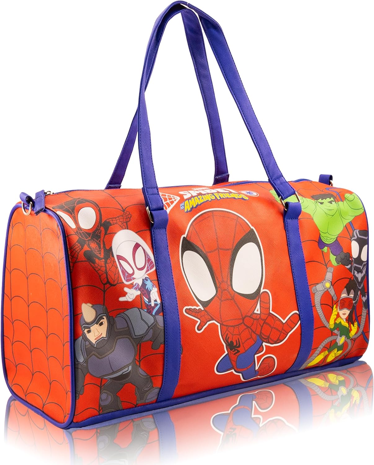 OFFICIALLY LICENSED MARVEL SPIDEY DUFFLE BAG: Let kids swing into action with this officially licensed Spidey and His Amazing Friends mini duffle bag. Featuring bold artwork of Spidey, Miles Morales, Ghost-Spider, and more, this colorful duffle is the perfect choice for toddlers, kids, or even teens who want to bring their favorite superheroes on every adventure—ideal for any Marvel or Spidey fan on the go.