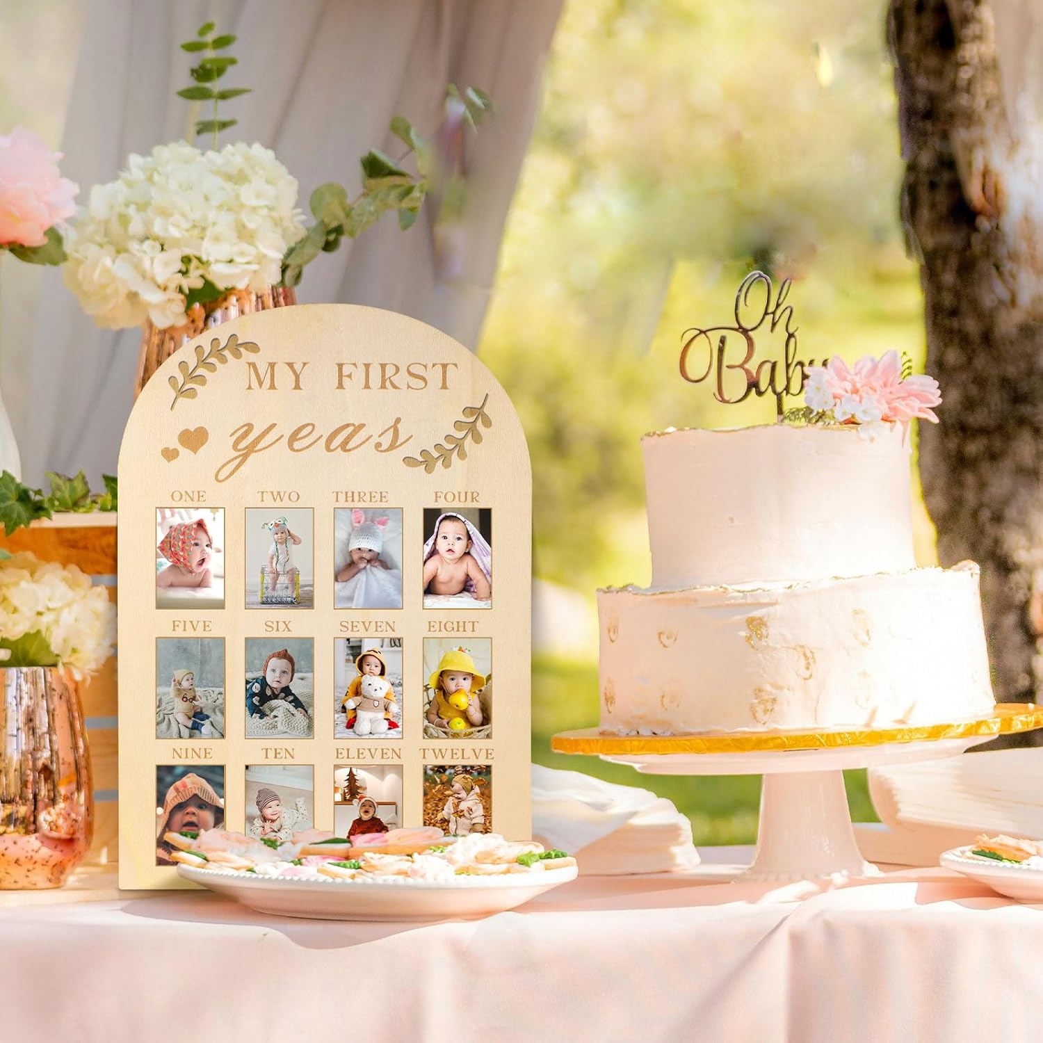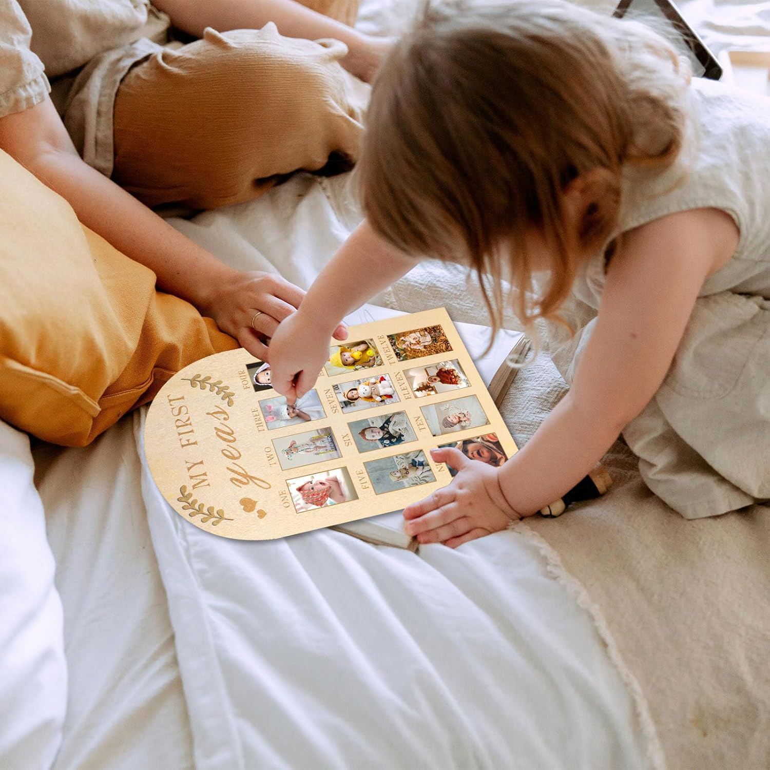 My First Year Picture Frame, One Year Of Birthday Photo Board, Wood Baby Growth Photo Display Personalized 12 Months Newborn Keepsake Gift for Baby 1st Birthday Girl Boy Nursery Decorations