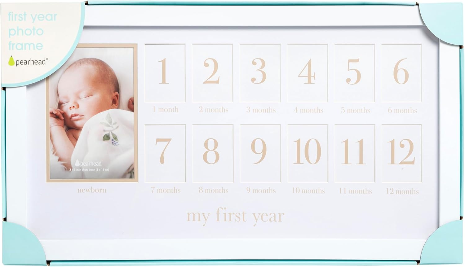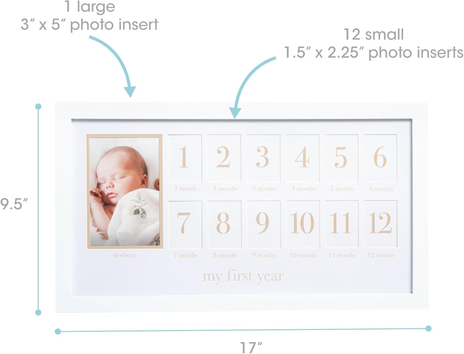 Celebrate every magical moment of your baby’s first year with Pearhead’s First Year Photo Frame, the ultimate baby keepsake to document your little one’s monthly growth milestones. This modern white frame is thoughtfully designed with “my first year” written in graceful taupe script, featuring 12 small photo inserts to highlight each month and a larger insert for the special newborn photo. With its timeless and gender-neutral design, this first year frame complements any nursery or home décor, making it a beautiful addition to your living space. It’s not just a family keepsake—it’s a daily reminder of how quickly your little one grows. Whether for your family or as a heartfelt mother’s day gift, father’s day gift, baby shower gift, or holiday gift for a loved one, this newborn photo frame ensures that every moment of your baby’s first year is captured, cherished, and proudly displayed for years to come. Product dimensions: 17” W x 9.5” H x .6” D; 1 large photo insert: 3” x 5” (large photo) and 12 miniature photo inserts 1.5” x 2.25”