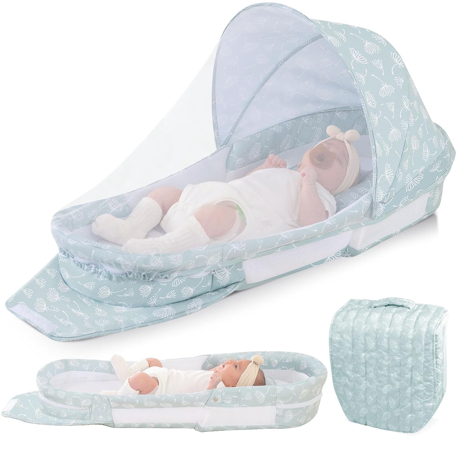 Portable Baby Lounger Bag, Foldabl Babies Nest with 2-in-1 Removable Mosquito Net, Infant Travel Nest Lounger, Easy Setup and Storage for Outdoors Indoors – Baby Registry (Light Green)