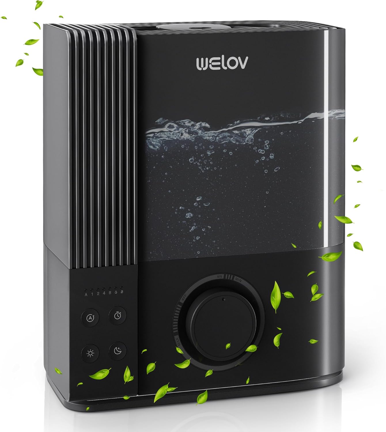 【Powerful Mist & 60Hrs Long-Lasting】The WELOV ultrasonic humidifier’s highest mist output can reach 300ml/h. It takes only 15 mins to humidify a 162ft² bedroom from 30% RH to 60% RH (comfortable). Quickly regulate the humidity throughout your room for relief from congestion, coughs, cold-like symptoms, allergies, dry skin, and sinus issues. With 4.5L(1.2Gal) water tank, it could release fine and clean mist up to 60 hrs. You can enjoy whole night sleep, frees you from refilling water frequently.