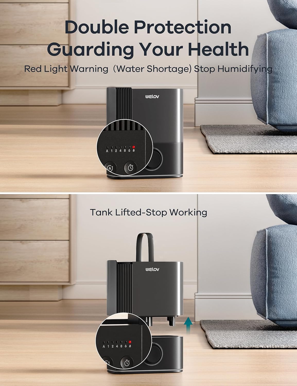 【Smart Auto Constant Humidity Design】No longer worry about over-humidification! ①With the built-in smart humidity sensor Tech, WELOV air humidifier can detect the humidity in the room and automatically adjust the amount of mist dispensed for optimal indoor comfort. ②You can also use the knob to control the amount of mist you prefer and the 360° nozzle to direct mist anywhere you like. It’s specially designed for your home, large room, bedroom, office, baby room, plants nursery, pets, etc.