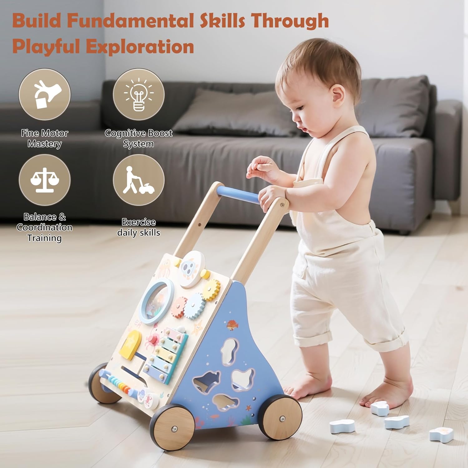 Wooden Baby Walker, Baby Push Walker with Montessori Toy for Girls Boys, Toddler Walking Toys for 18 Months of Age and Over Learning to Walk, Sit-to-Stand, Baby Activity Center for Kids Development
