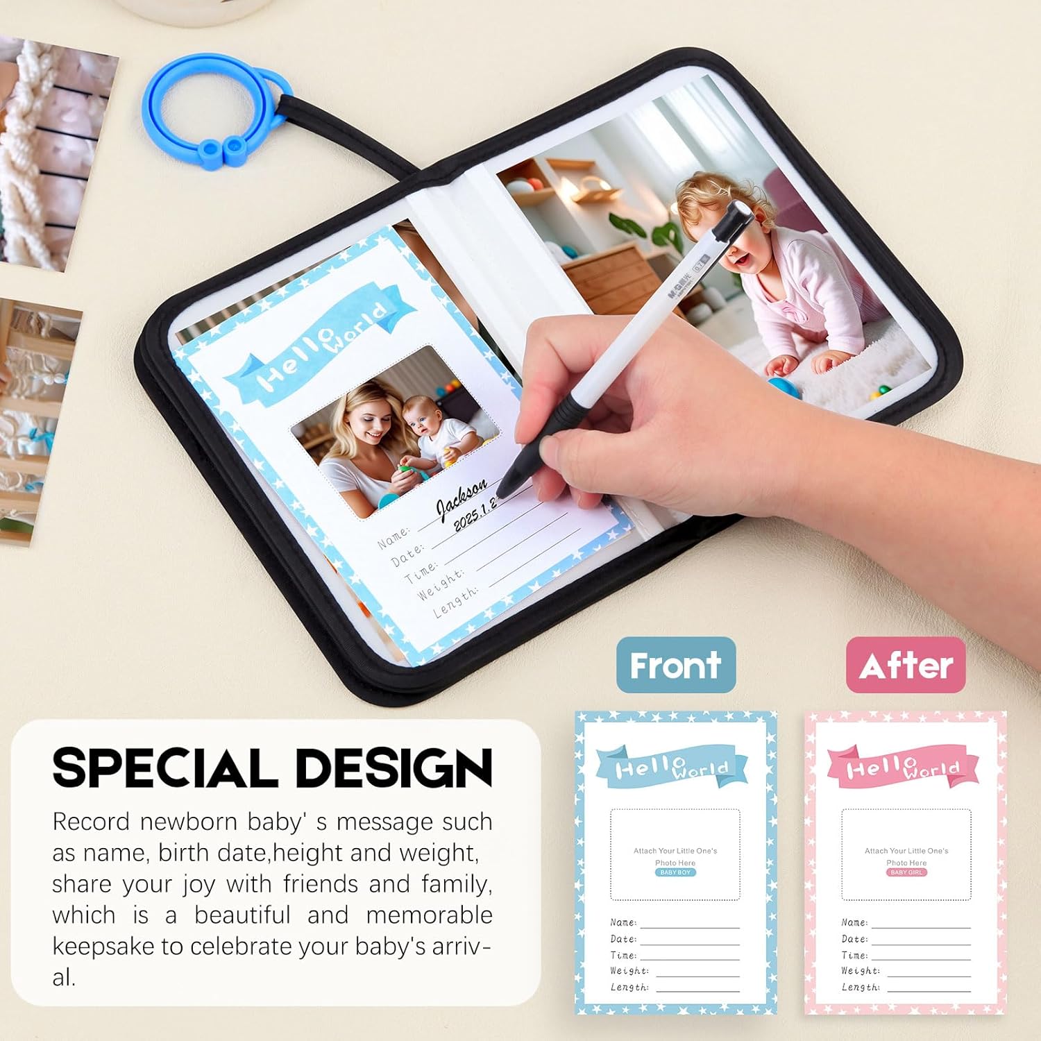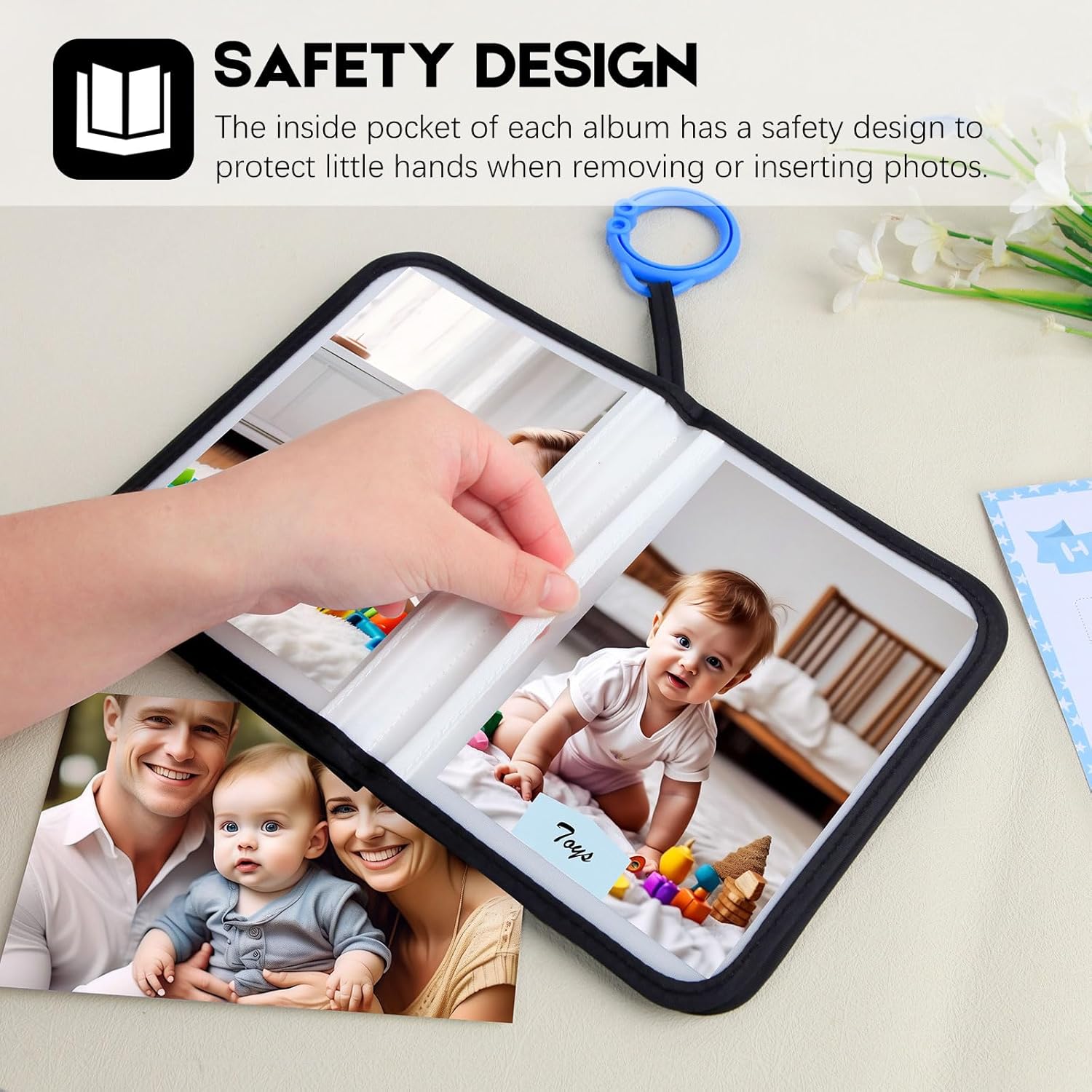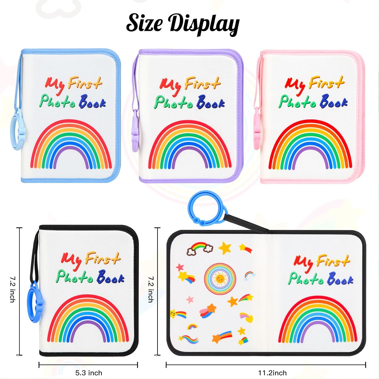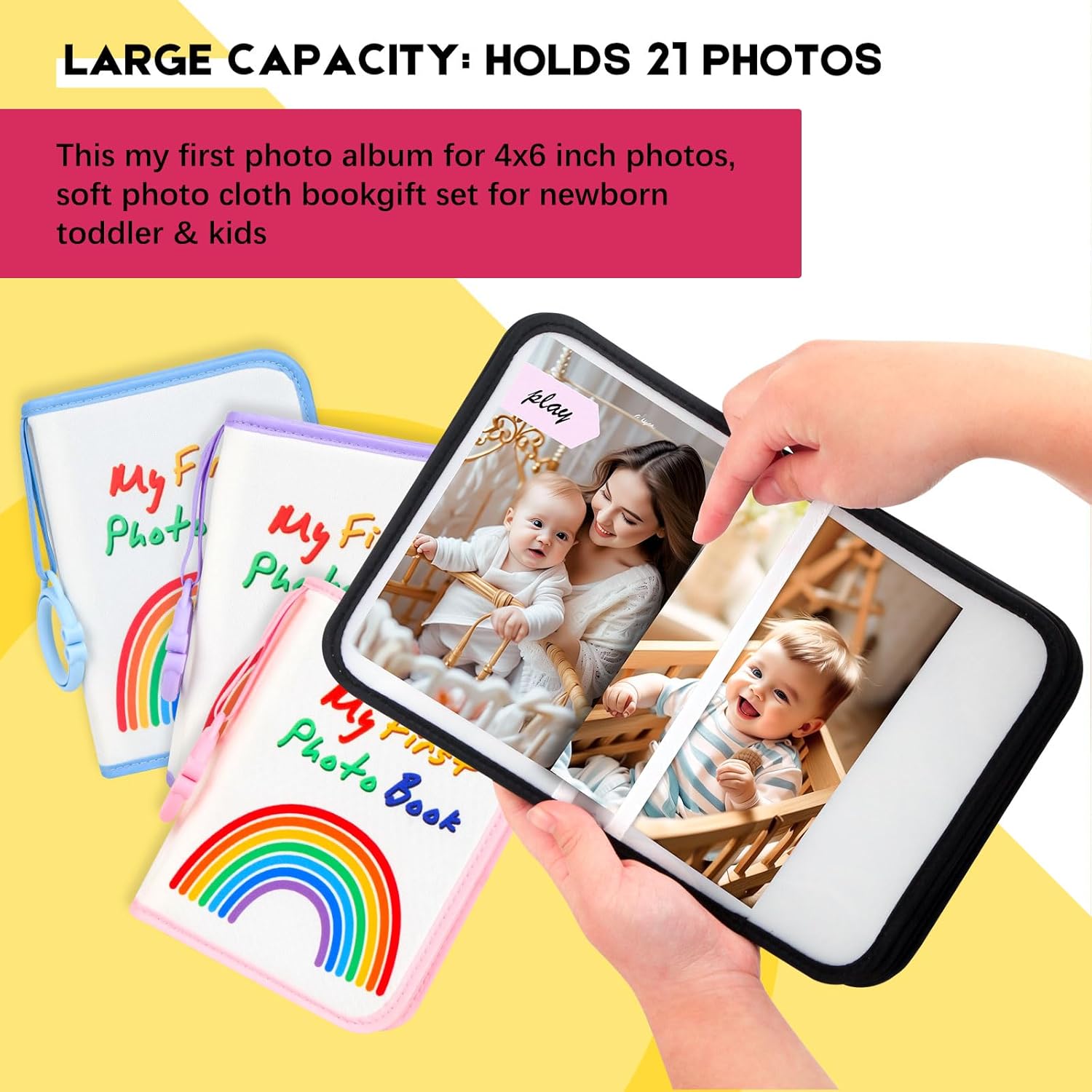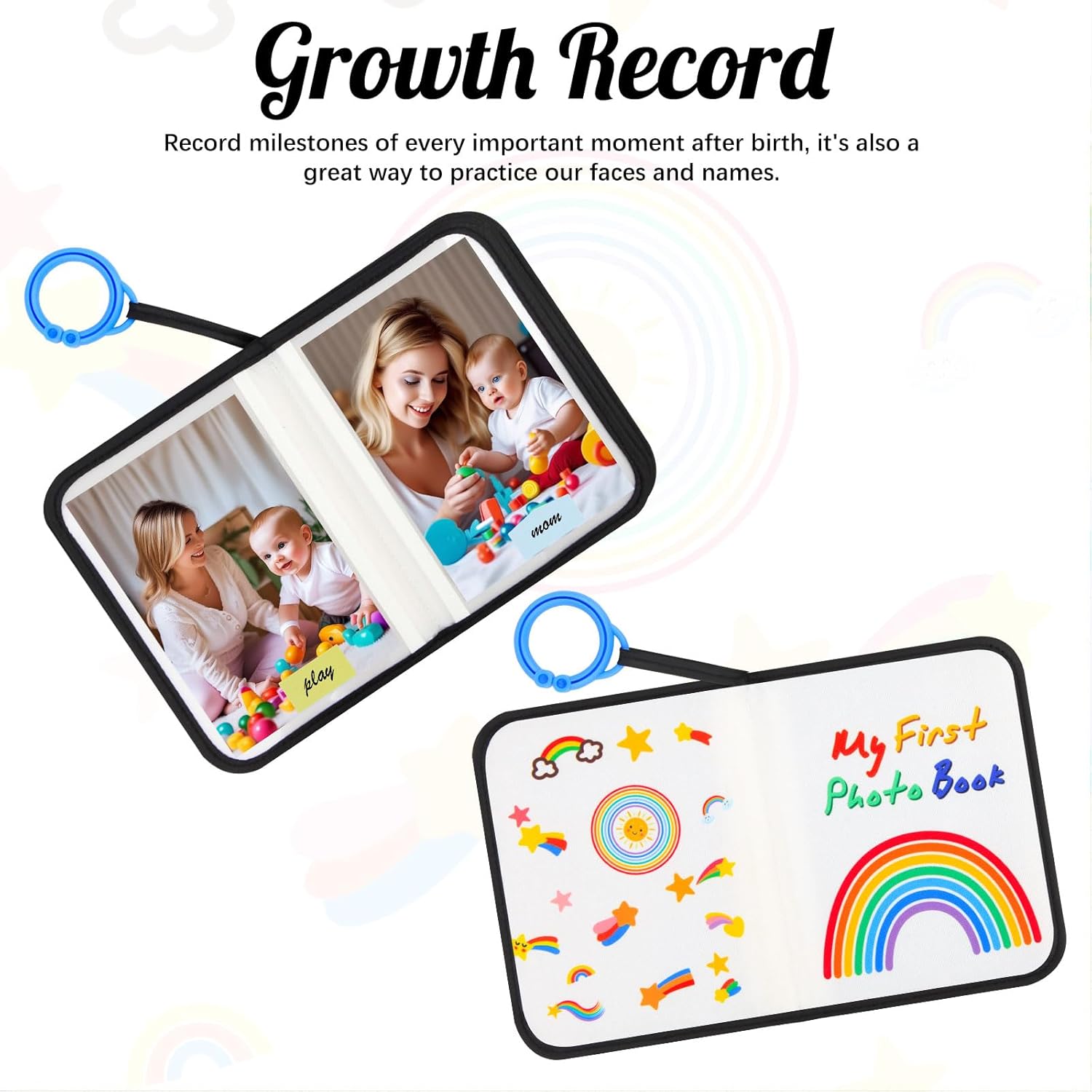PERFECT SIZE: This small baby photo book is perfect for baby’s tiny hands. Holds up to 21 4×6 inch photos. Clear photo pockets, can protect pictures from baby’s drool, pictures won’t stick to pockets, easy to insert and remove. The star hook can be easily attached to the cot, pram, etc. Child safety mirror on one side in the middle of the last page of the album.