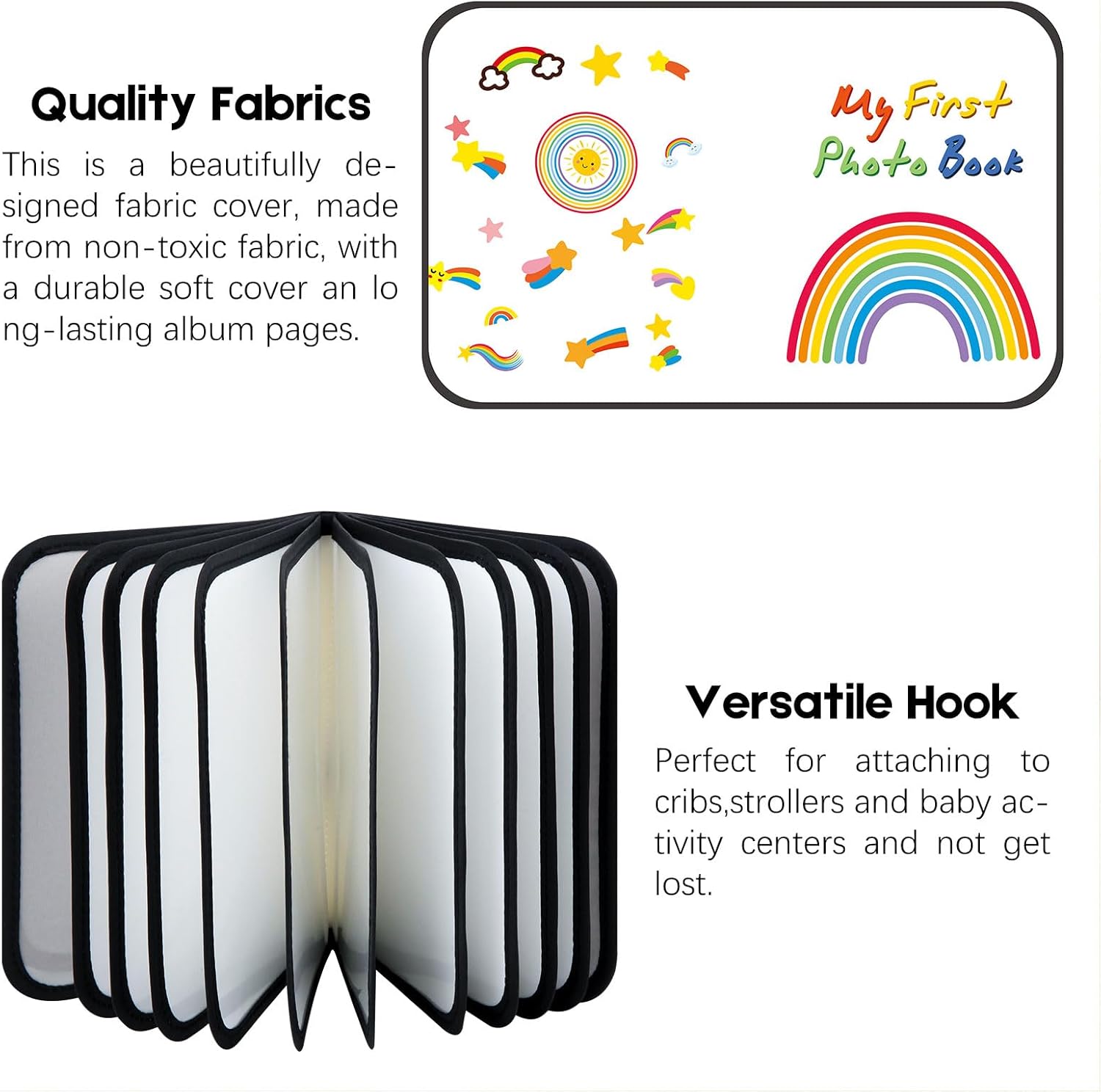HIGH QUALITY FABRIC MATERIAL: This soft photo book is made from child safe and environmentally friendly fabric that is non-toxic and odourless. The cute cover pattern will not fade. The inside photo slots are smooth and odourless. The surface and edges of the family album are covered with a soft cloth, as are the inside pages of the album, very safe for babies.