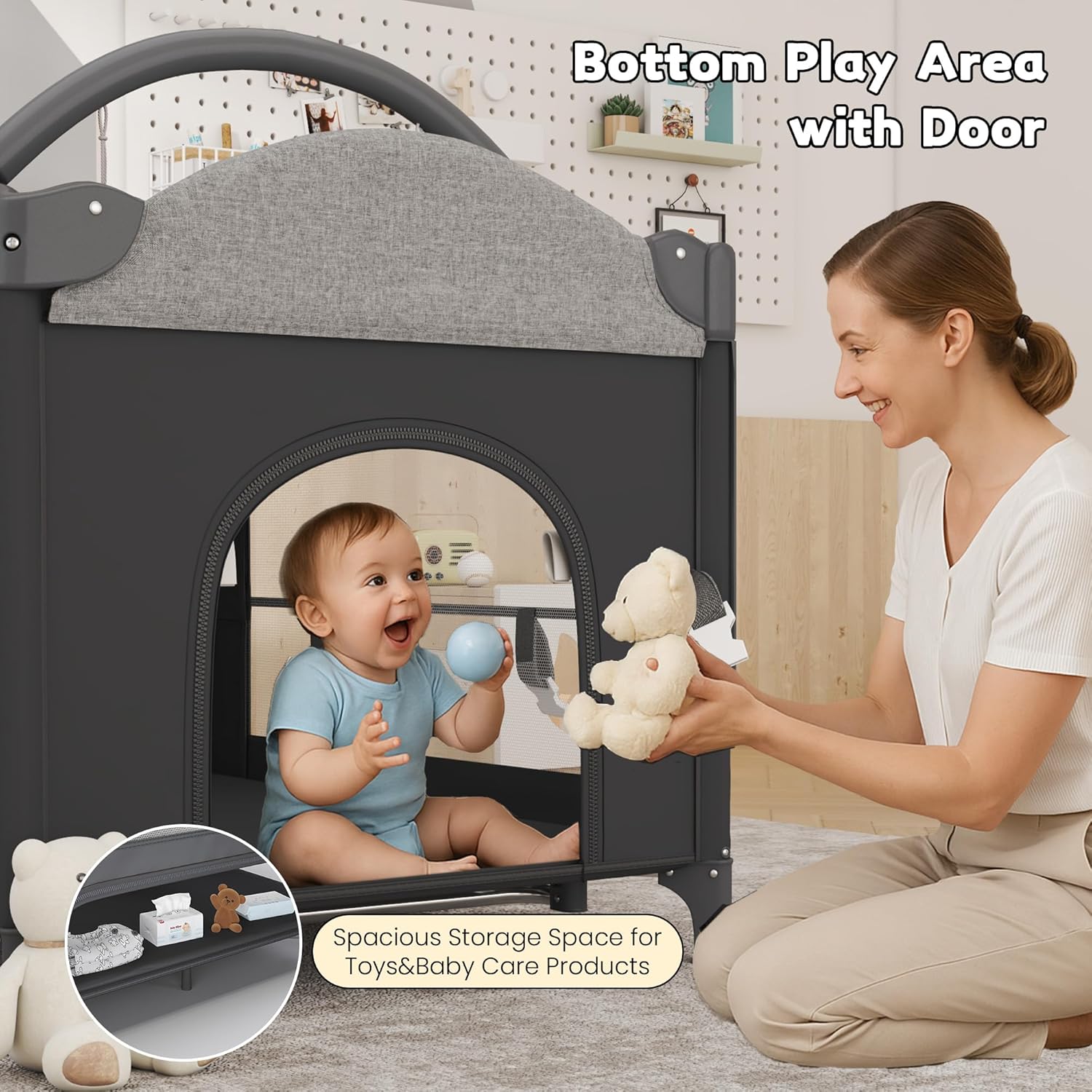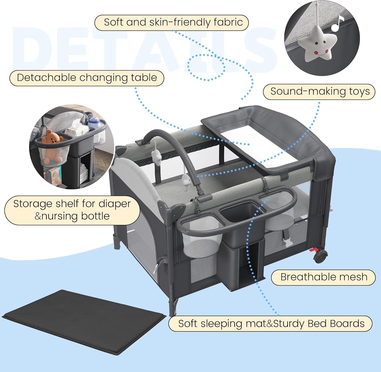 【Multifunctional Design&Sufficient Storage Space】The baby bassinet is designed with multi-functionality, the base is equipped with a swinging tube, which can be pulled out to transform into a cradle.Featuring a waterproof and easy-to-clean changing table with sponge and MDF padding, and a half-mesh mosquito net to protect your baby from insects.Versatile storage solution accommodates toys, bottles, and more, making every changing moment efficient and stress-free