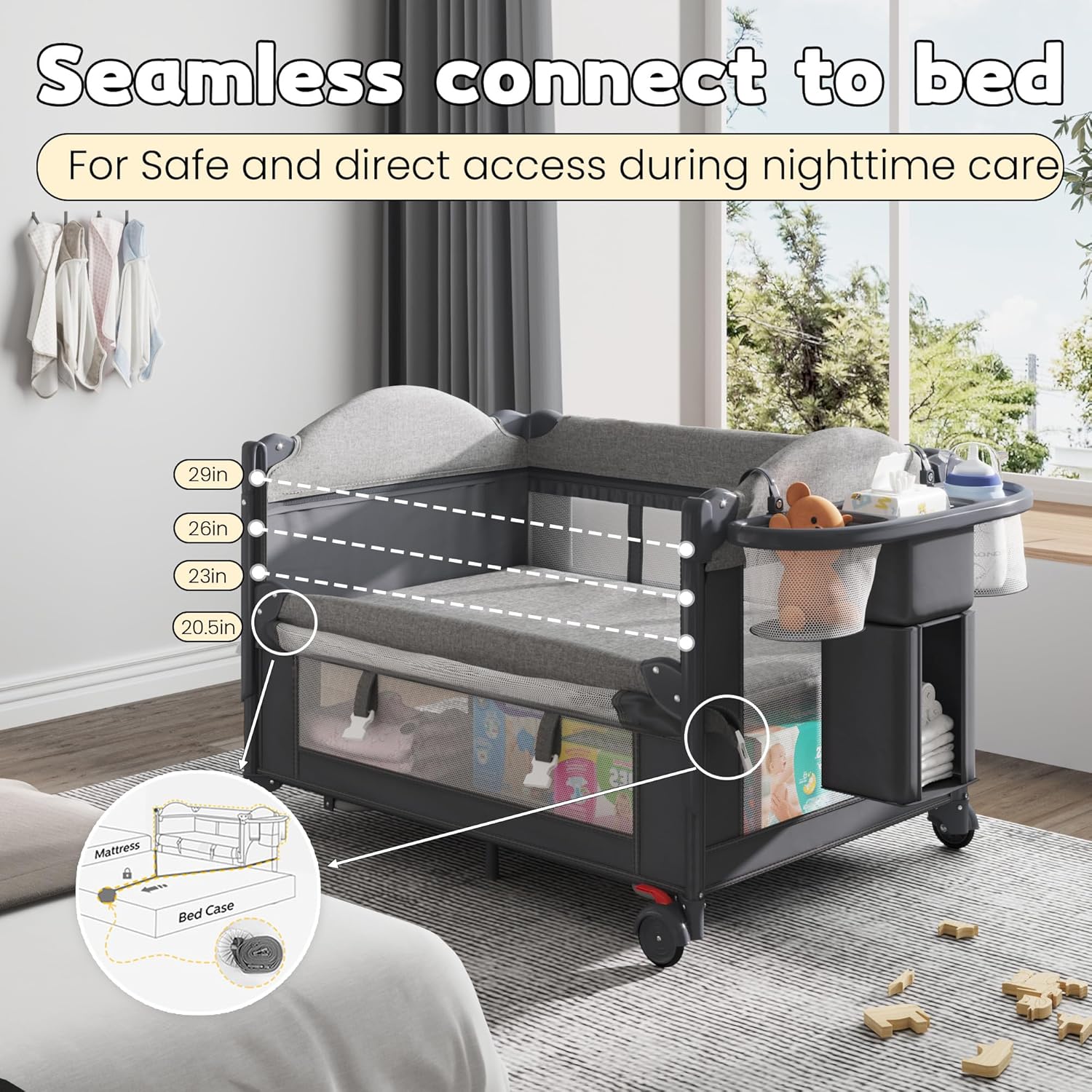 【Convenient for Taking Care】This bedside sleeper bassinet features a sturdy frame and a four-sided. The bed height is adjustable with 4 levels, allowing you to easily create intimate moments with your baby. Equipped with lockable wheels for easy mobility and a reliable brake system, It includes a safety strap connected to your bed to ensure stability and make it easy for you to take care of your baby at night