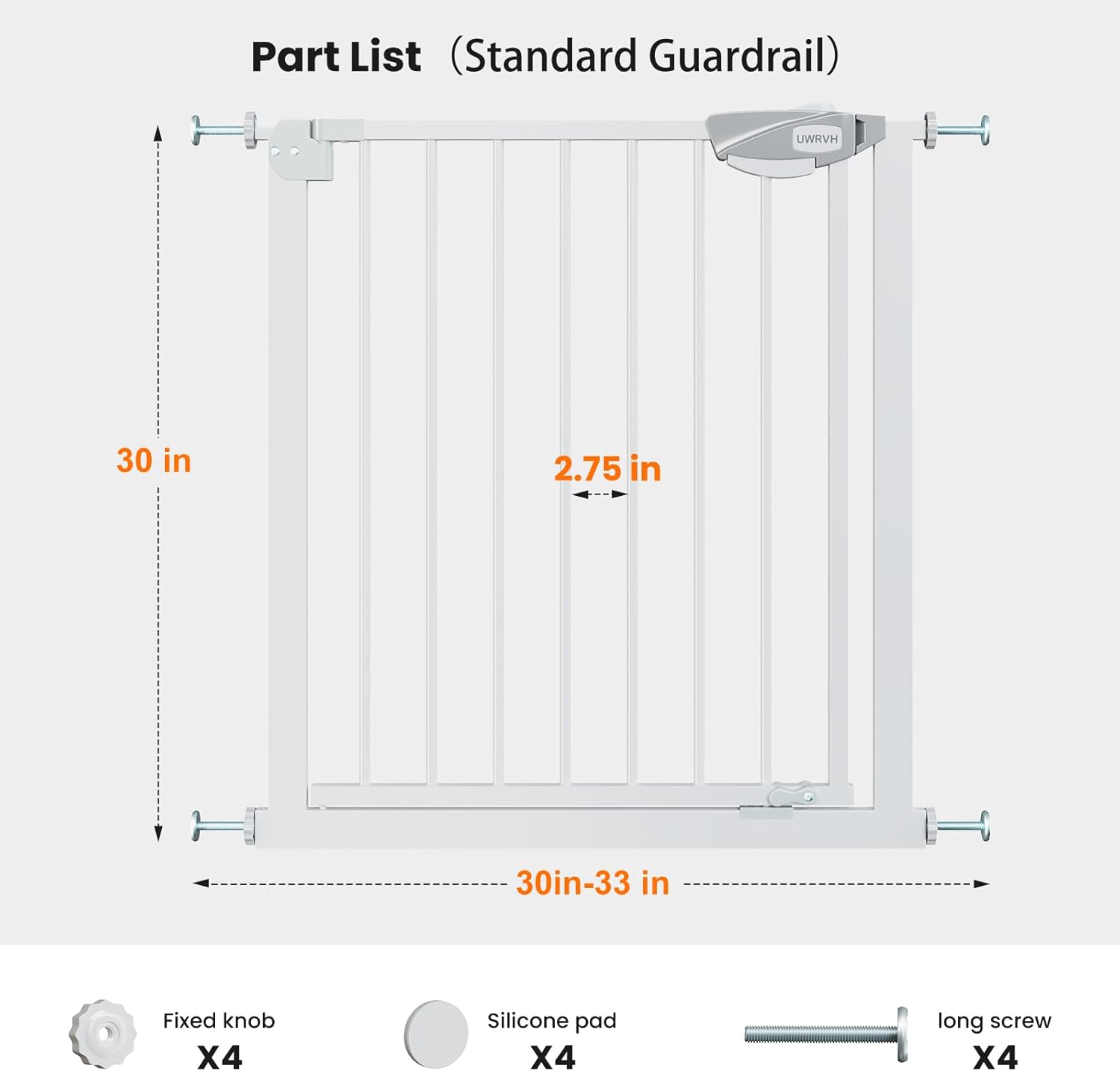 Suitable for multiple scenarios: kitchen, staircase, room, etc. This walk-through baby gate adjusts to fit doorways from 29” to 33” wide and stands 30” high.
