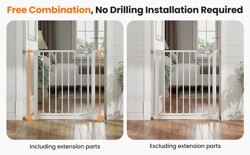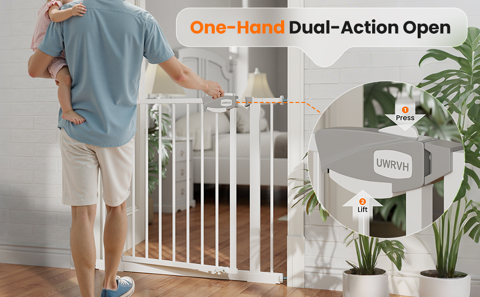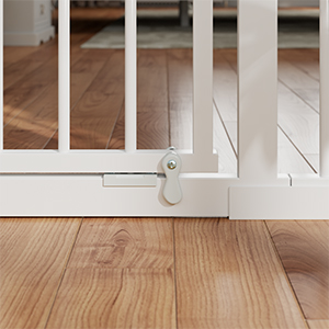 Double safety lock: To prevent babies or dogs from opening the door barrier, we have designed a double safety lock. Press the button and pull it up simultaneously. It requires force on both sides. Only adults can understand this method of opening.