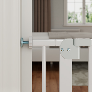 Auto-close: This easy walk through baby gate is equipped with an auto-close function. The door can be automatically closed when opened less than 90°, reducing the potential danger for dogs and babies of forgetting to close the door. The door can swing in two directions.