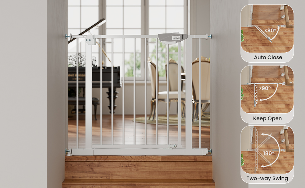 Auto-close: For added hands-free convenience, this safety gate is equipped with an auto-close function. The door can automatically close when opened to less than 90°, reducing the potential danger for dogs and babies forgetting to close the door. The gate only swings in one direction to avoid the danger of swinging over stairs.
