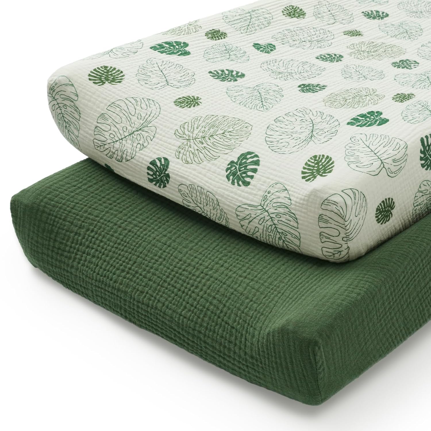 Blissful Diary Muslin Changing Pad Cover for Girls Boys, Ultra Soft Breathable Cotton, Baby Diaper Change Table Pad Covers, 2Pack (Monstera Leaves&Dark Green)