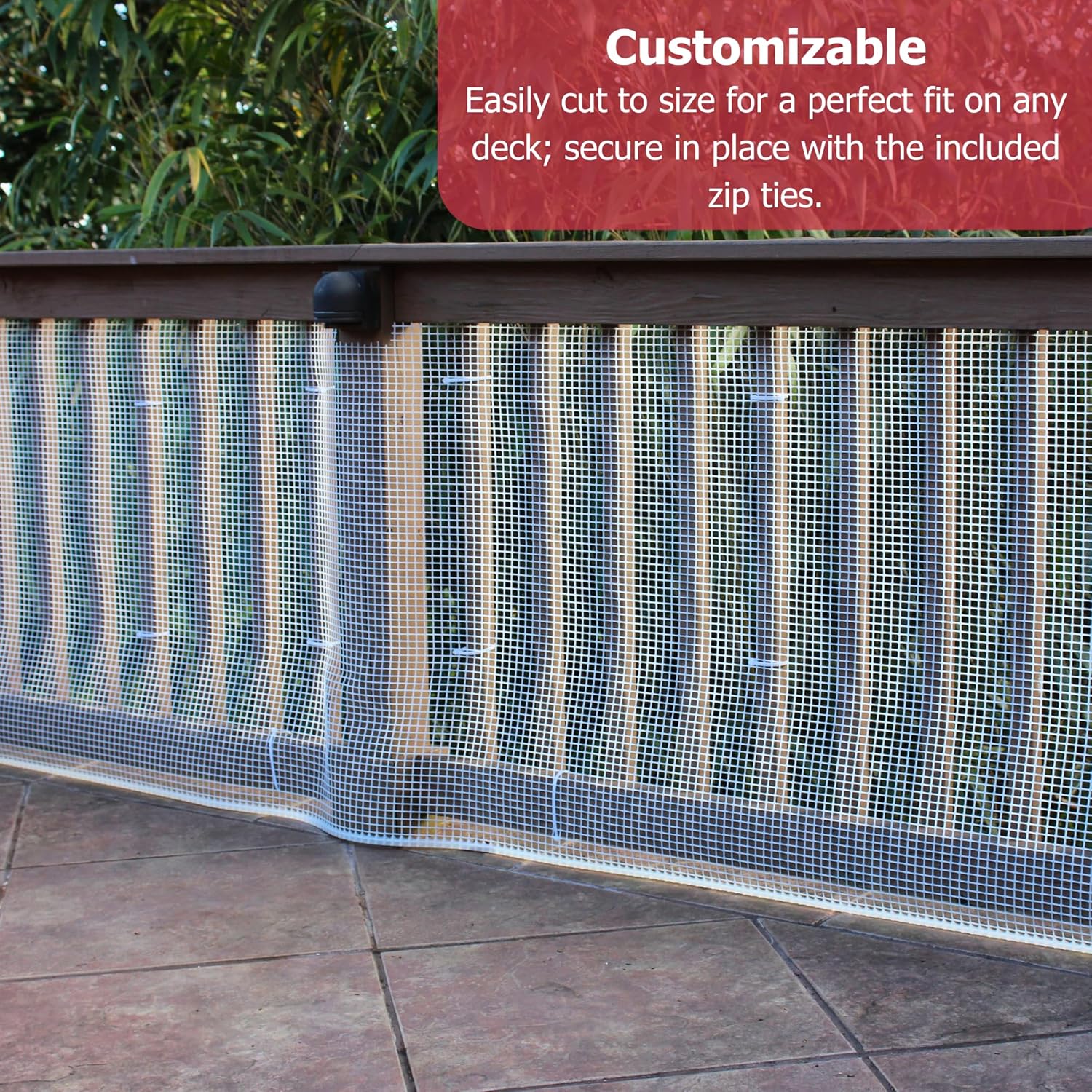 DECK SAFETY NETTING – Keeps children and pets safe from openings in porches and balconies. Deck netting secures the gaps in decks that can be hard to baby and puppy proof. This durable balcony barrier is entirely weather-resistant and will not fray or loosen from pushing and pulling.