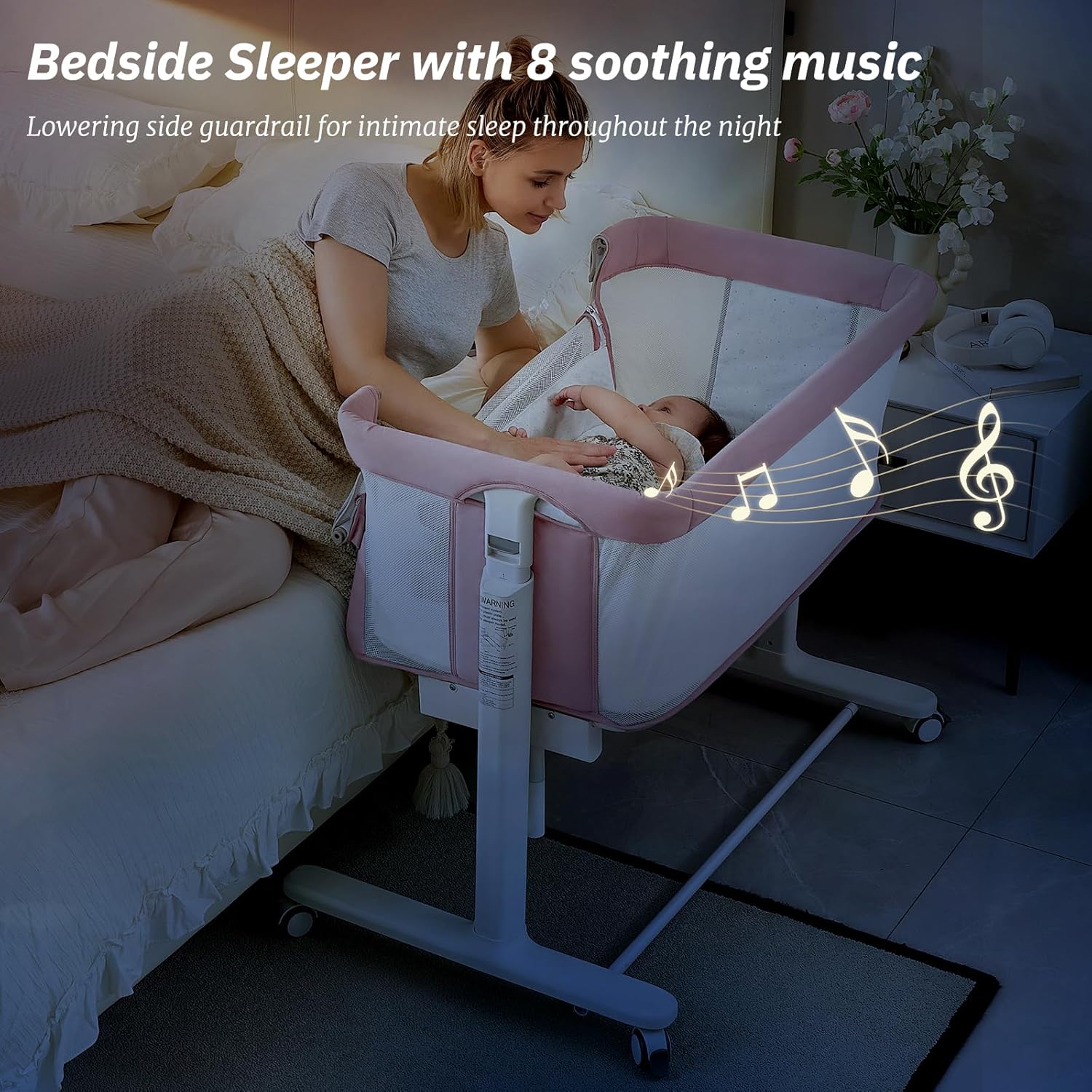 Smart Rocking Bassinet: Features 3 rocking speeds that mimic a mother’s womb, with 5 lullabies and 3 white noise options to soothe baby. Easily switches to bedside mode for convenient nighttime care.