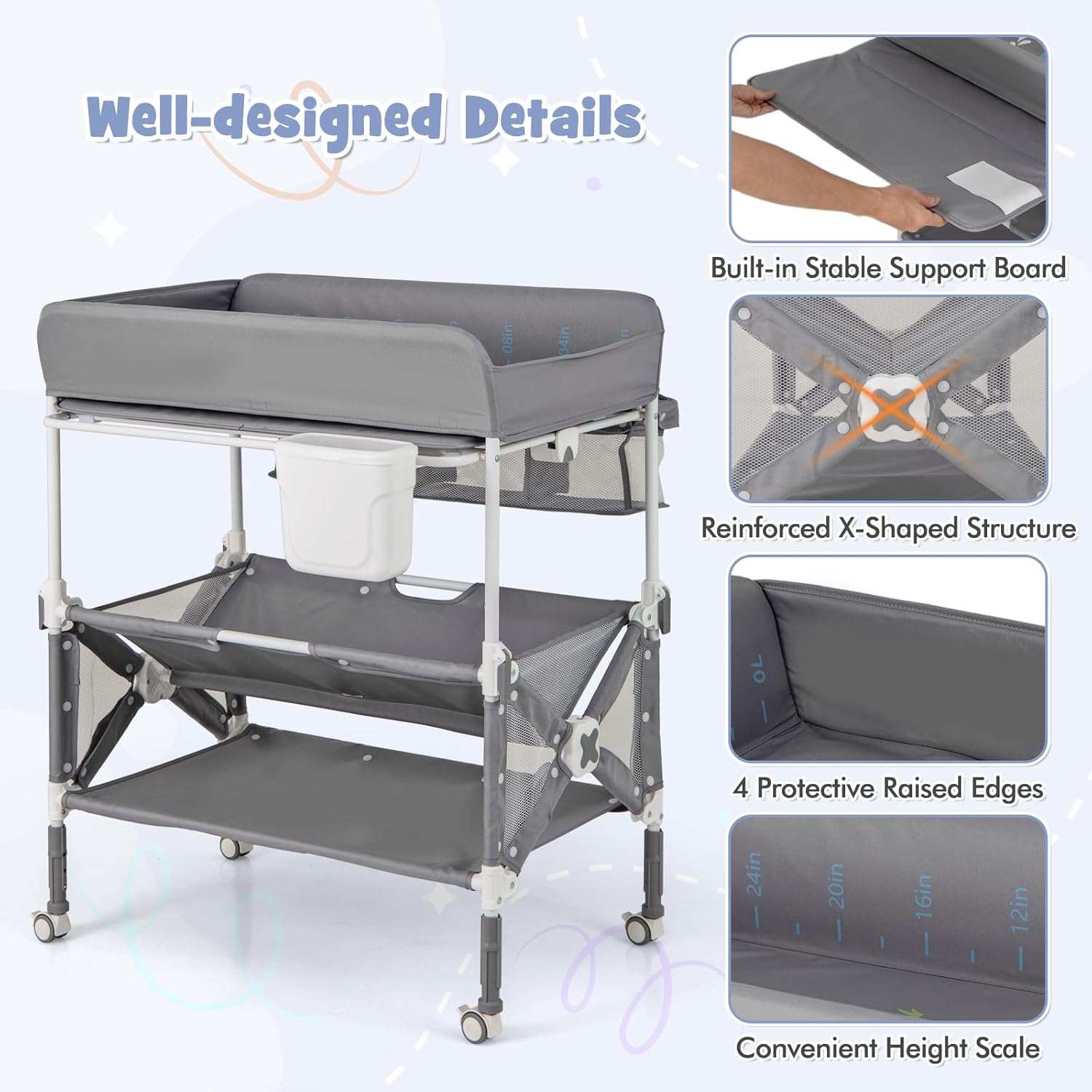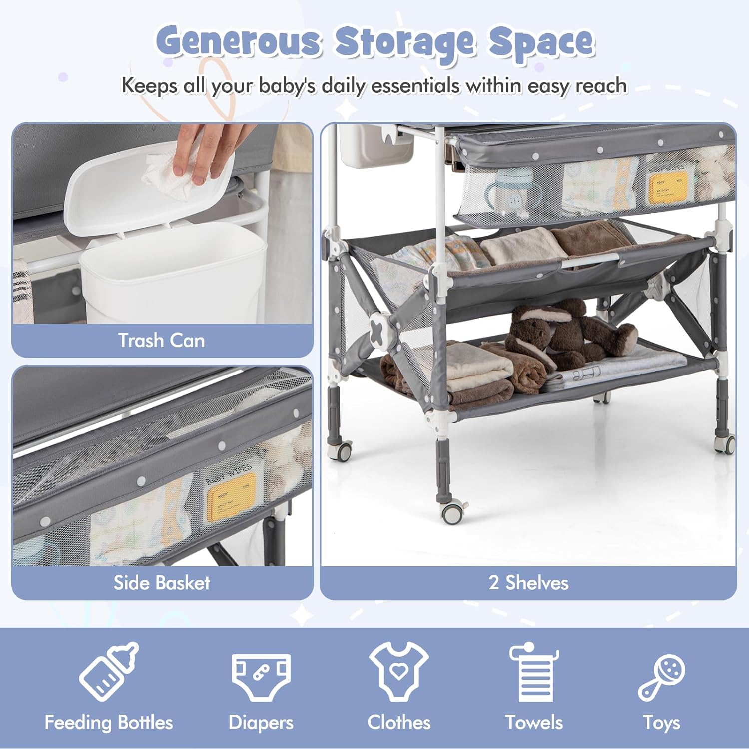 Folding Design & Easy Mobility: Simply open 4 latches and press the button on both sides to quickly close the frame. You can fold this portable changing station into a compact size for easy storage and transport. In addition, 4 lockable universal wheels make it easy to move the unit wherever you want.