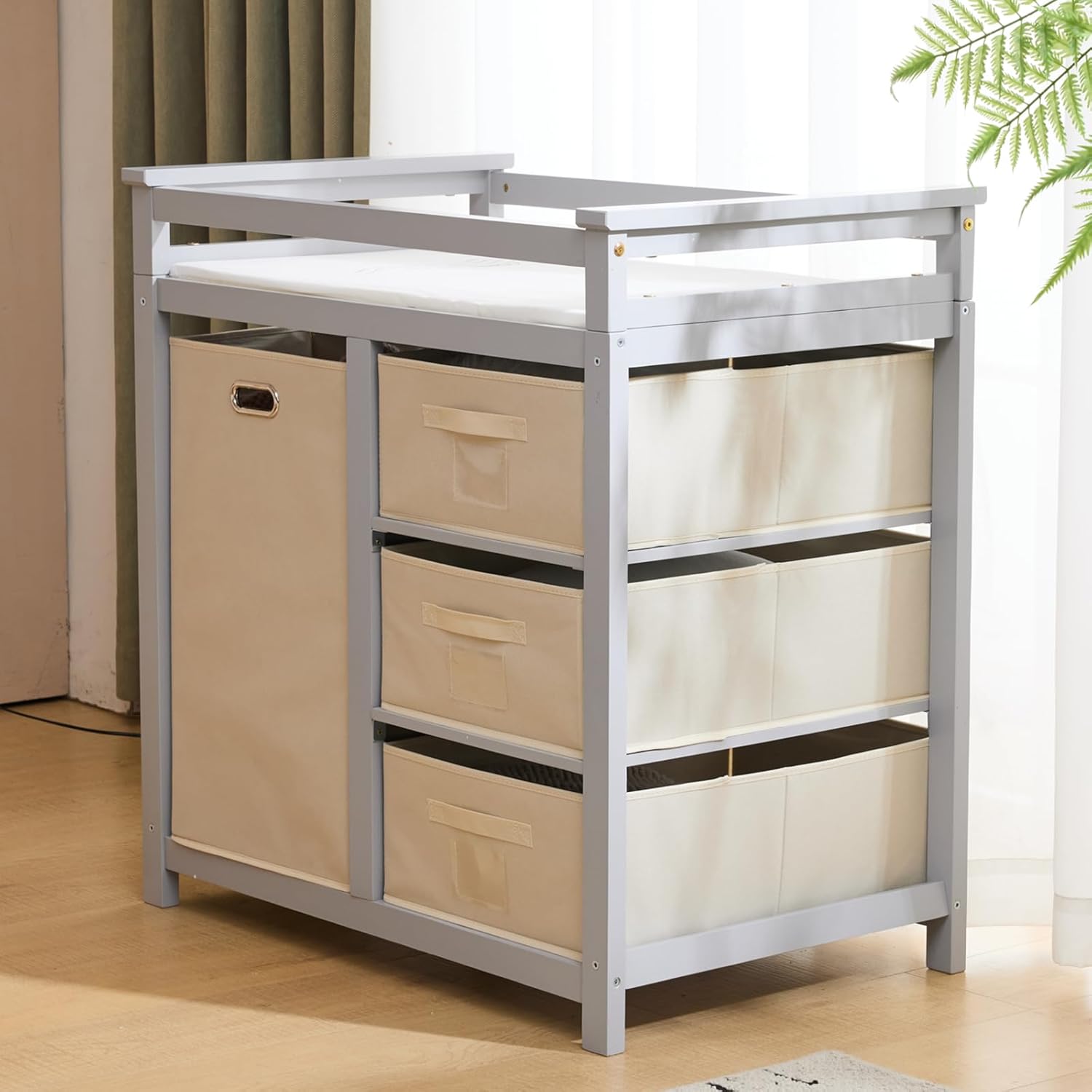 Karl home Modern Baby Changing Table,Dresser Baby Diaper Changing Station with Laundry Hamper,Infant Nursing Table with 3 Storage Drawers,Removable Safety Rail& Strap for Nursery,Bedroom,Grey