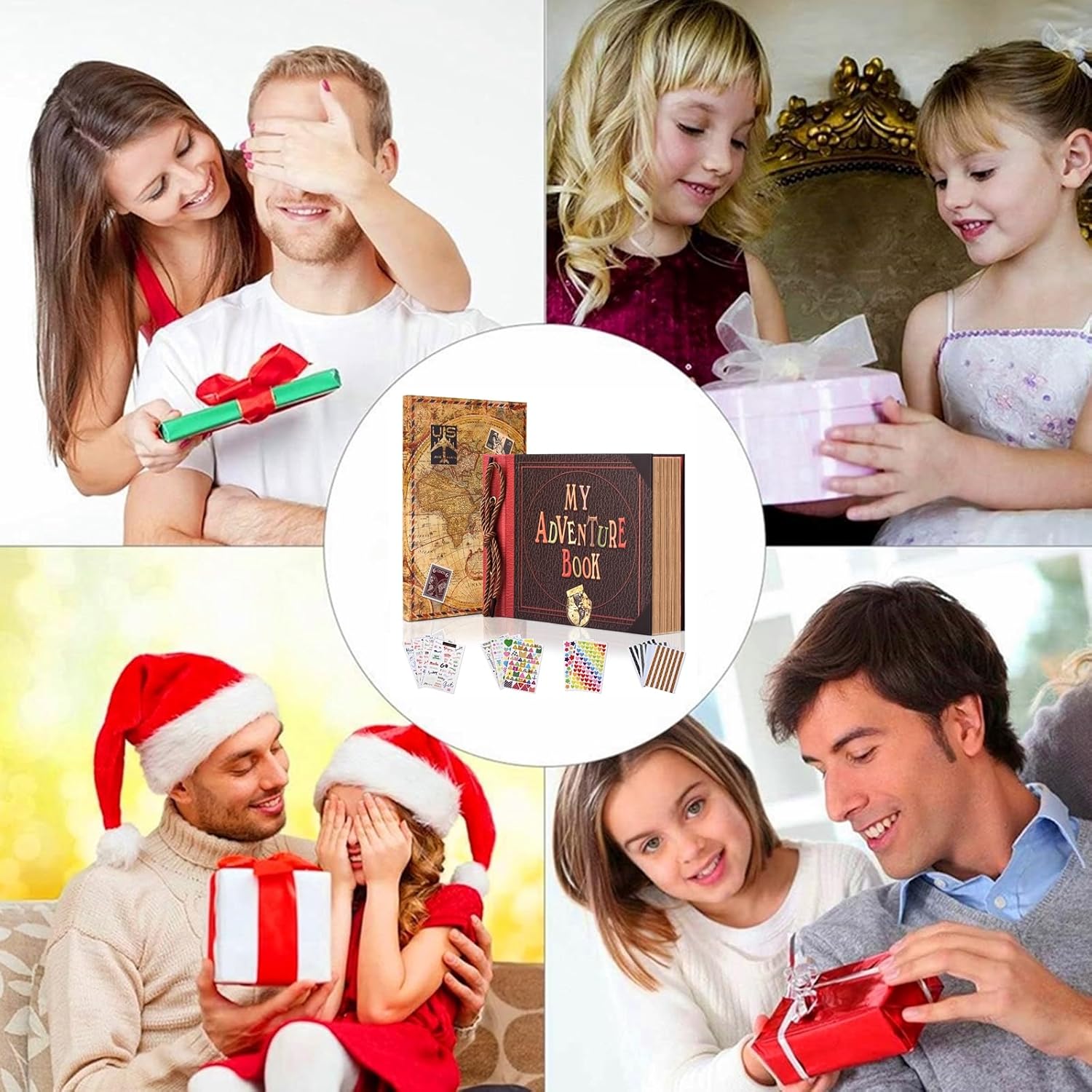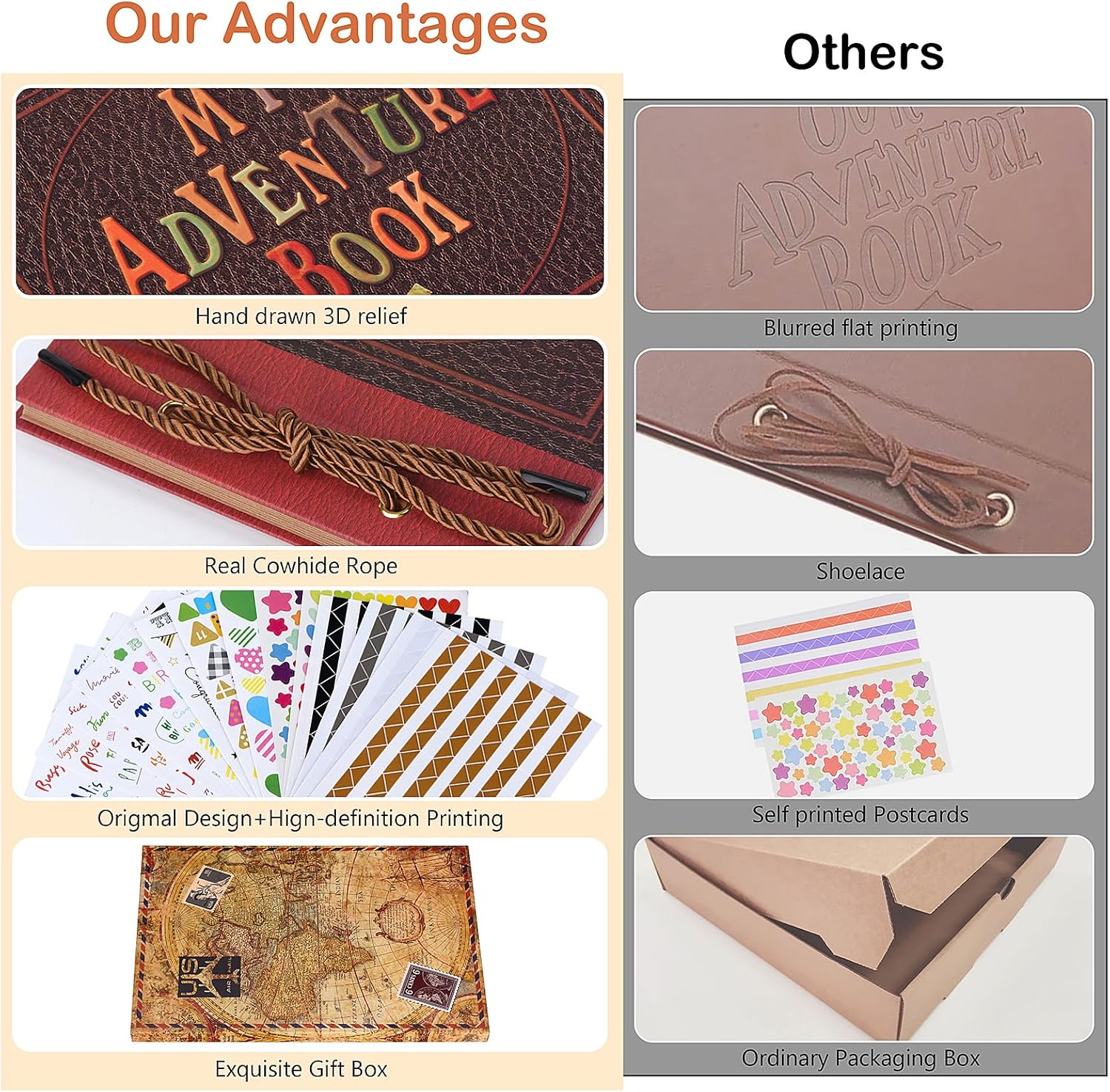 High Capacity & Quality:This album measures 10.24 x 7.09 x 0.39 inches and can hold over 100 photos or postcards. It features 20 sheets (40 pages) plus an additional Baby Album Home Page, providing ample space for capturing and displaying precious memories. Additionally, this adventure book doubles as a notebook with smooth, writable pages, perfect for jotting down notes, thoughts, and memories. It’s perfect for documenting your journey on its pages.Comprehensive Gift Set – Adventure Theme:This “Adventure Book” set includes everything you need to create a unique keepsake: a scrapbook, 4 corner stickers, 2 pages of DIY stickers, 8 multifunctional stickers, and a special DIY baby photo album introduction homepage. It serves as a fun and romantic commemorative gift for couples, babies, and families, as well as a cherished family keepsake!High-Quality Materials:Made from thick kraft paper, ideal for writing, drawing, and pasting photos. Designed to be a memorable gift for family and friends, allowing the creation of a handmade album to store cherished memories. The seamless page-turning ensures easy writing and recording, with each sheet laying completely flat. Add a personal touch to your memories with colorful pens and corner stickers, creating a unique and personalized DIY album.Educational and Developmental: This “My Adventure Book” album is designed to encourage DIY activities and children’s brain development. Through family photos and imaginative storytelling, it promotes emotional and cognitive growth, social interaction, and literacy skills. Whether used as a wedding guest book, a repository for family gatherings, or a vivid record of your world travels, this scrapbook captures the colorful moments of life.Perfect for Any Occasion – Gift Box:Whether it’s a baby shower, birthday, wedding, or travel memory, this album serves as a versatile and cherished gift. It comes in a high-quality storage box, making it a thoughtful present that will be treasured for years to come.