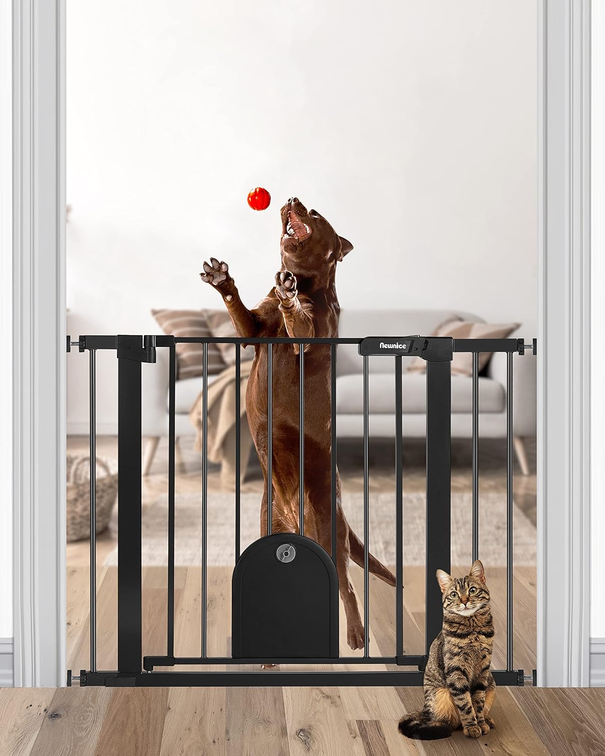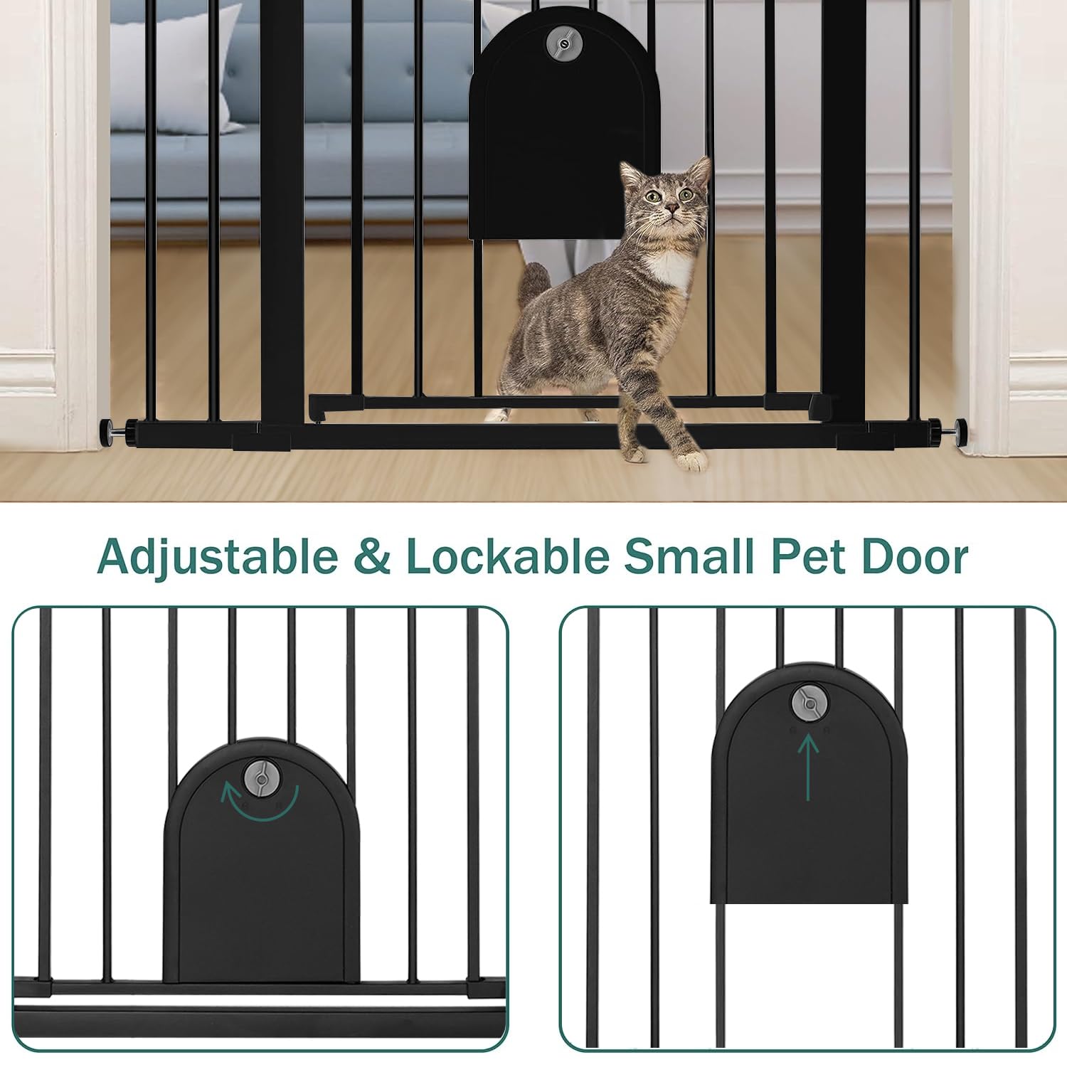 EASY TO INSTALL & AUTO-CLOSE- Pressure mounted baby gate with pet door for cats, no tools required. It is super easy and fast. You can open it with one hand, even while holding a baby. Auto-close pet gate with cat door, no worries about forgetting to lock the safety gate, it will automatically close less than 90°.