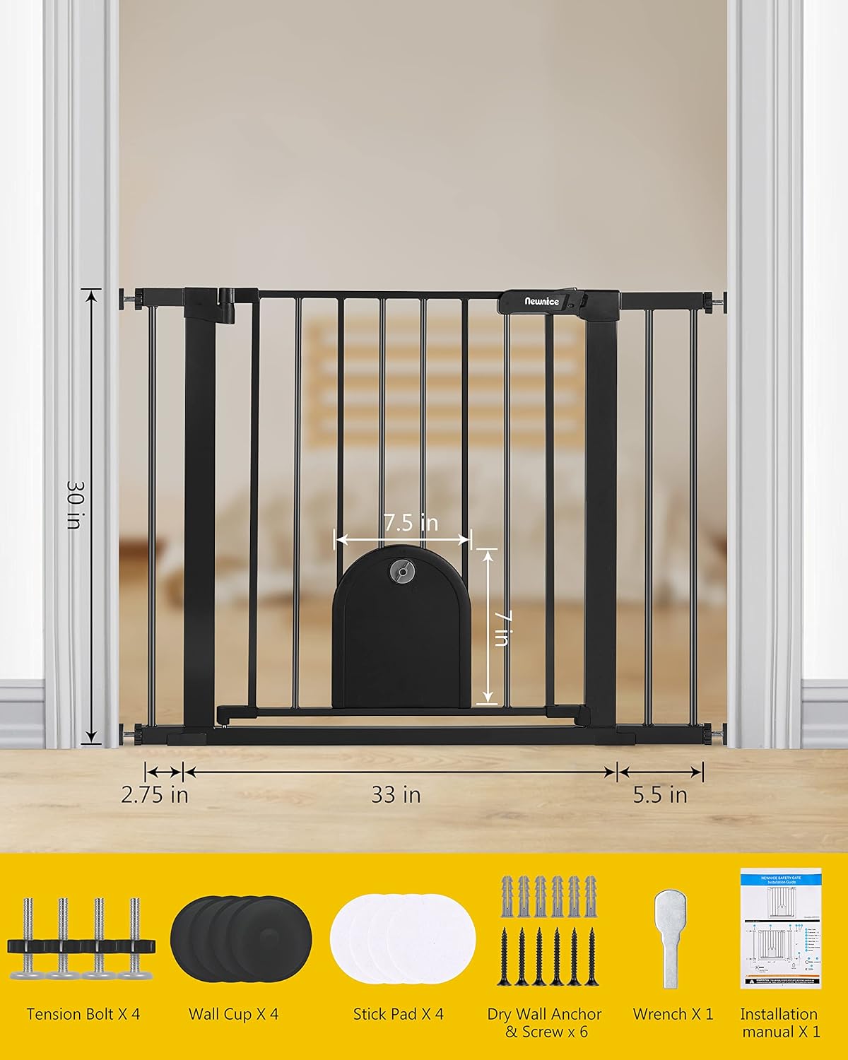 Works for pressure mounted or hardware mounted. EASY WALK THRU DOG GATE- The dog gate with cat door is 30″ tall and adjustable 29.7″-40.6″ width with the included 2 extensions. Easy walk thru dog gate is perfect for doorway, hallway, kitchen, and stairs.