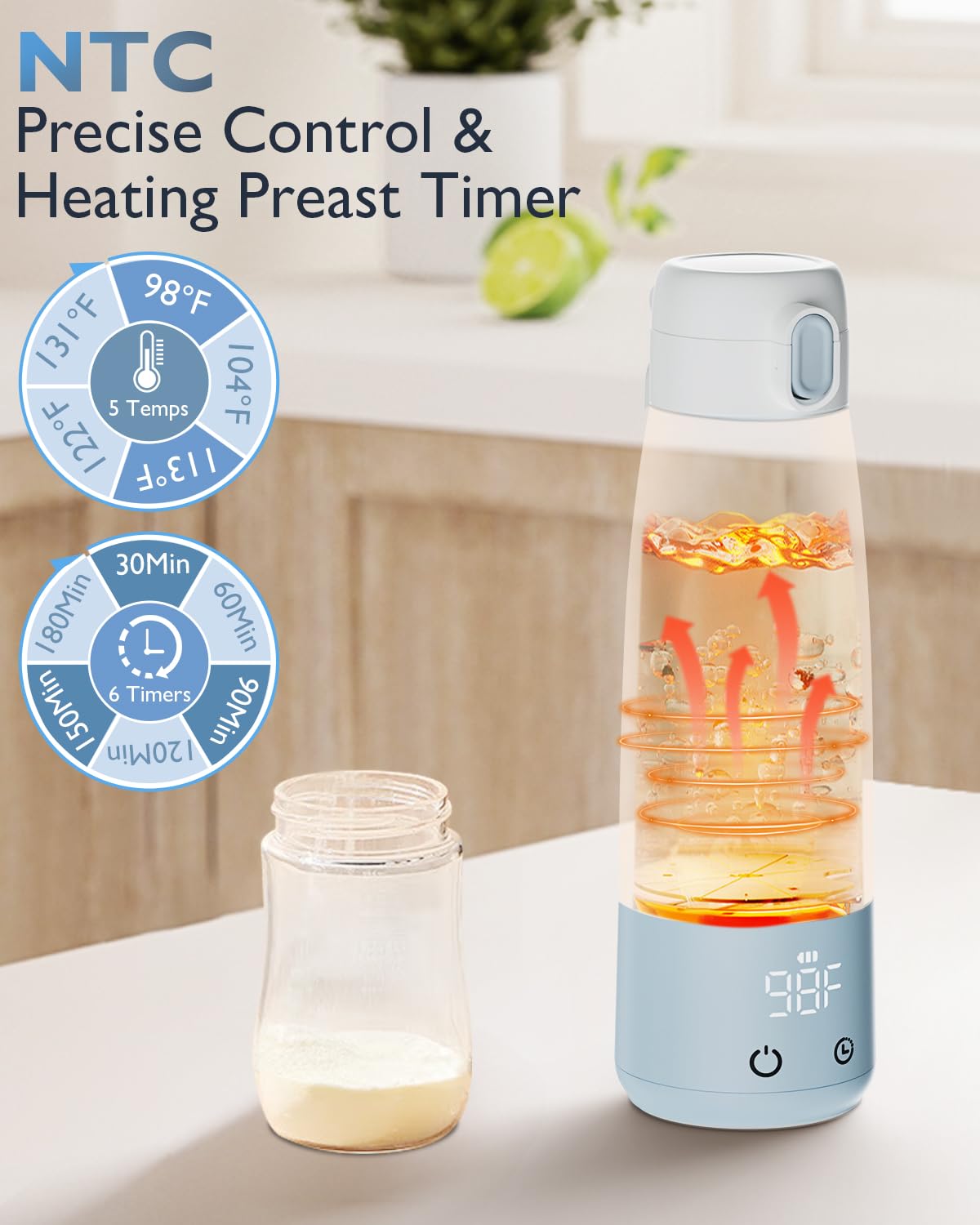 NTC Sensor Precise Temperature Control: With 5-level adjustable NTC temperature settings (98°F/104°F/113°F/122°F/131°F), this portable bottle warmer offers precise control to ensure your milk is always at the ideal temperature. It uses advanced thick-film fast heating technology to heat up 30% faster, with anti-dry burning protection for safe use.