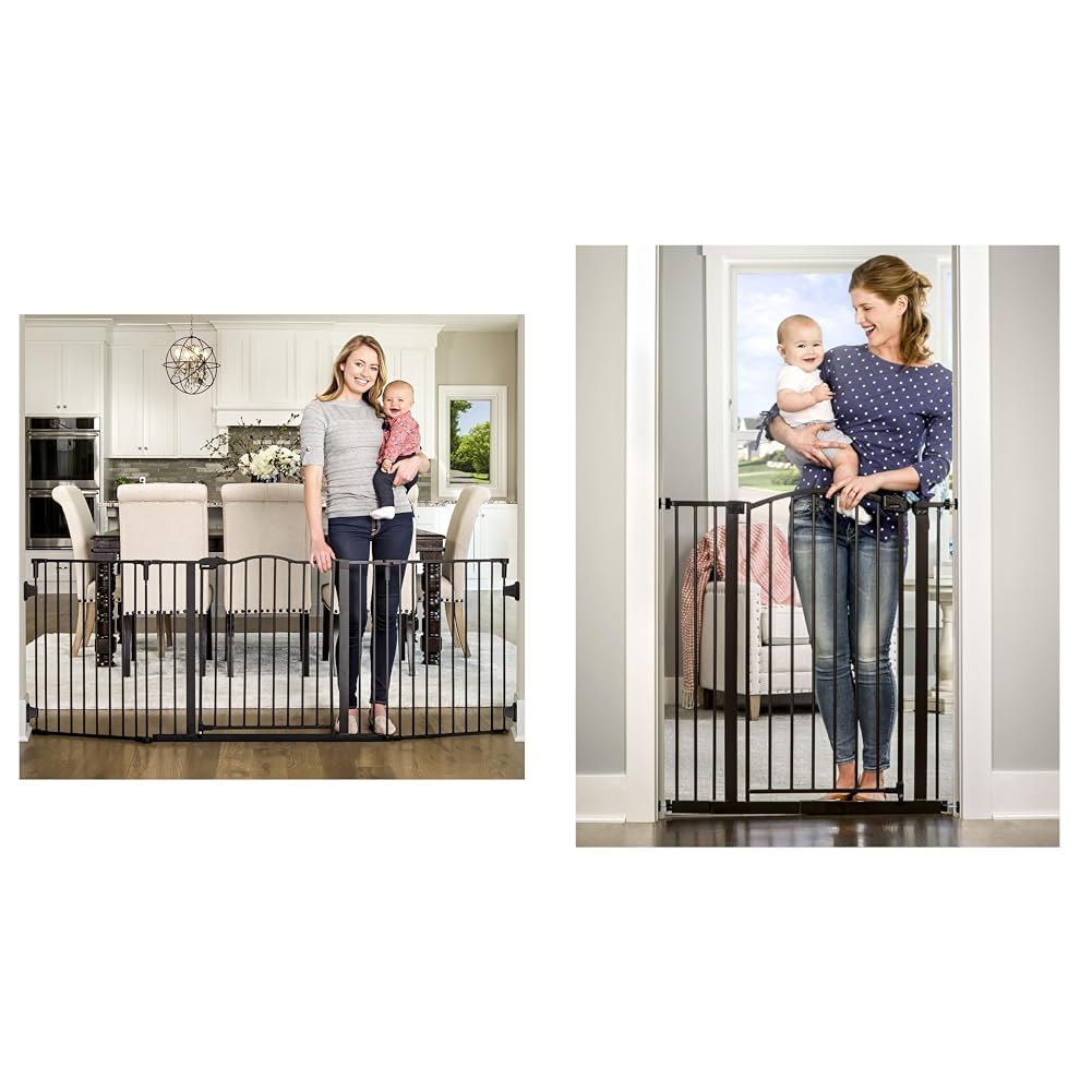 The Regalo deluxe home safety bundle includes two complementary baby gates to provide versatile protection for your home. The main 74.5-inch wide Regalo deluxe gate is made of durable steel and features a walk-through door that can accommodate openings between 56 and 74.5 inches. Its premium black finish allows it to blend into any home décor. The included 36-inch tall Regalo arched gate complements with an upscale bronze finish and also includes a walk-through door. It is adjustable to fit openings 29 to 35 inches wide. Together these gates provide secure coverage for wide, angled, and tall openings in your home. The deluxe gate is wide enough to span extra-large spaces, while the arched bronze gate adds a touch of style perfect for doorways. Both meet safety standards and fold flat for convenient storage when not in use. Multiple included mounting kits allow you to choose hardware or pressure mounts for simple installation. With their pet-friendly designs and secure latches, this bundle keeps kids and pets safely contained. An essential childproofing tool, it provides peace of mind while allowing convenient access throughout the home.