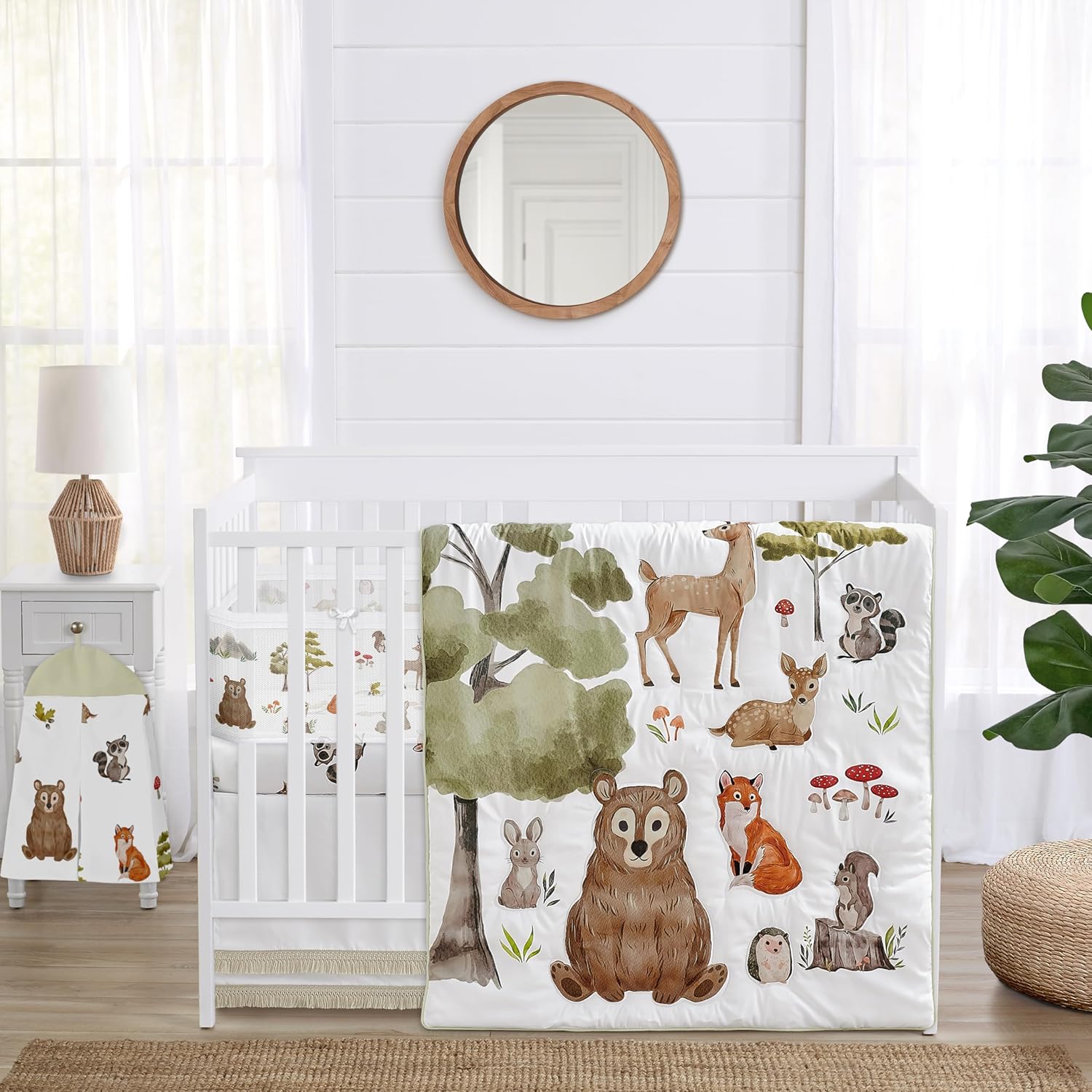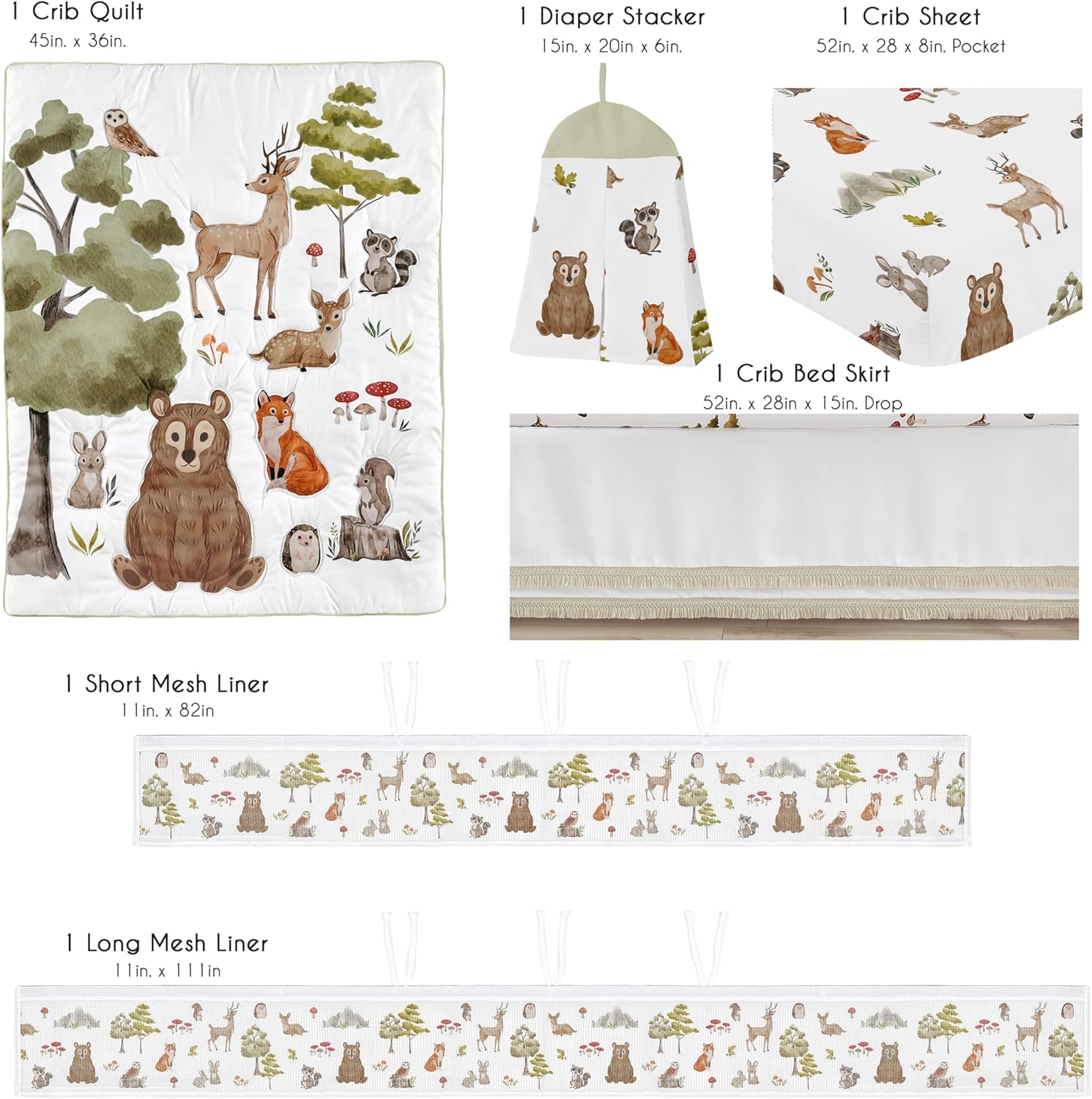 6 PIECE CRIB BEDDING SET INCLUDES: Crib Comforter (45in. x 36in.), Fitted Crib Sheet (52in. x 28in. x 8in. Pocket), Crib Skirt (52in. x 28in. x 15in. Drop), Diaper Stacker (15in. x 20in. x 6in.), Long Panel Mesh Liner (11in. x 111in.) & Short Panel Mesh Liner (11in. x 82in.). An infant crib set including all the baby essentials is a great value compared to purchasing pieces separately. This baby crib set features the color palette of brown, orange, red & green to bring your baby room together.