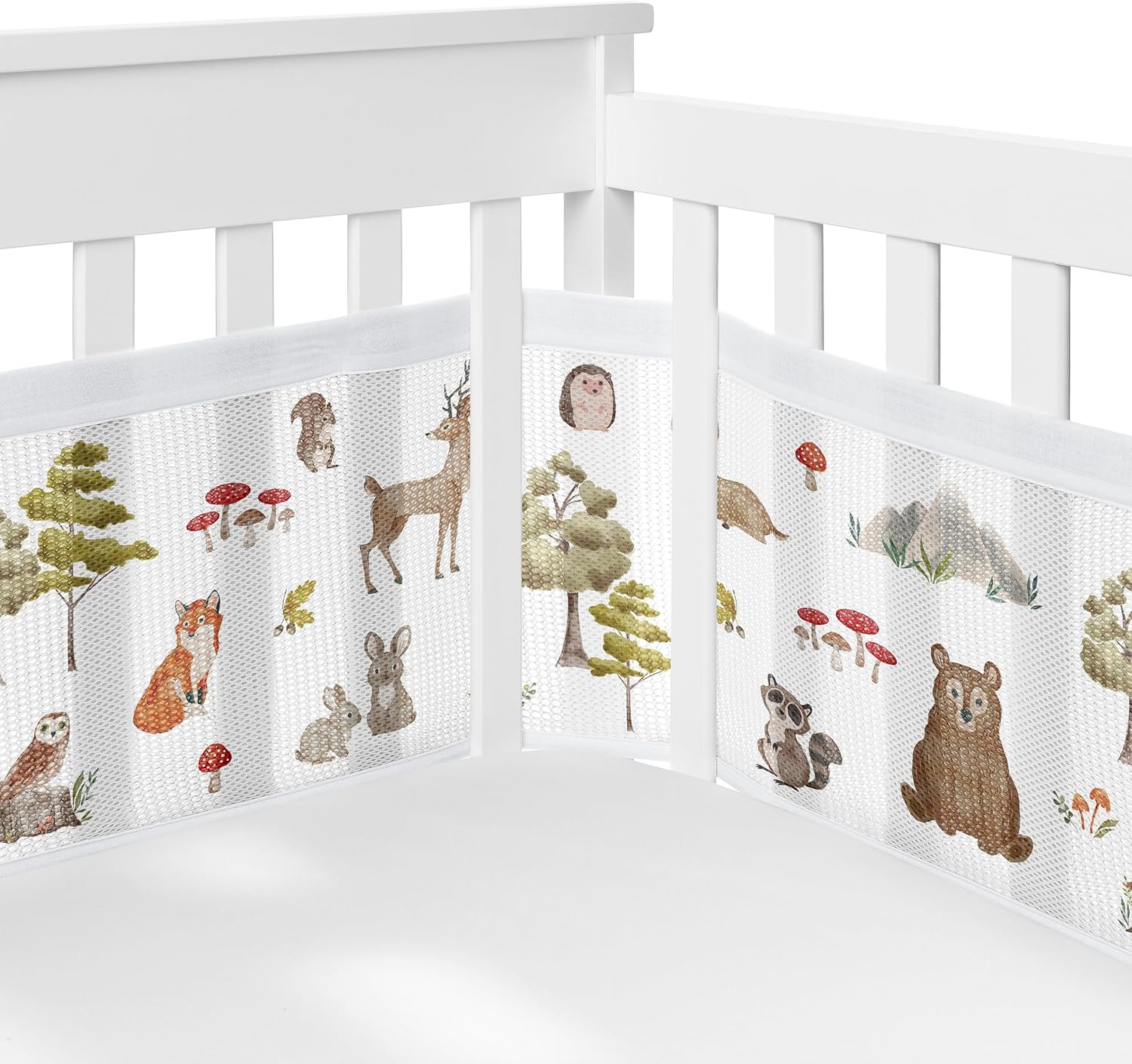 FOREST ANIMALS THEME: This baby boy bedding set boasts a crib blanket featuring a watercolor deer, owls, bears, bunnies, foxes, squirrels & raccoon. The mesh liners feature a woodsy animal print. The white skirt is made with two rows of delicate bohemian macrame fringe detailing. The forest pals breathable crib sheet has elastic sewn around the bottom edge for a secure fit on most standard cribs. The matching diaper stacker keeps nappies conveniently organized. Machine washable. Tumble dry low.