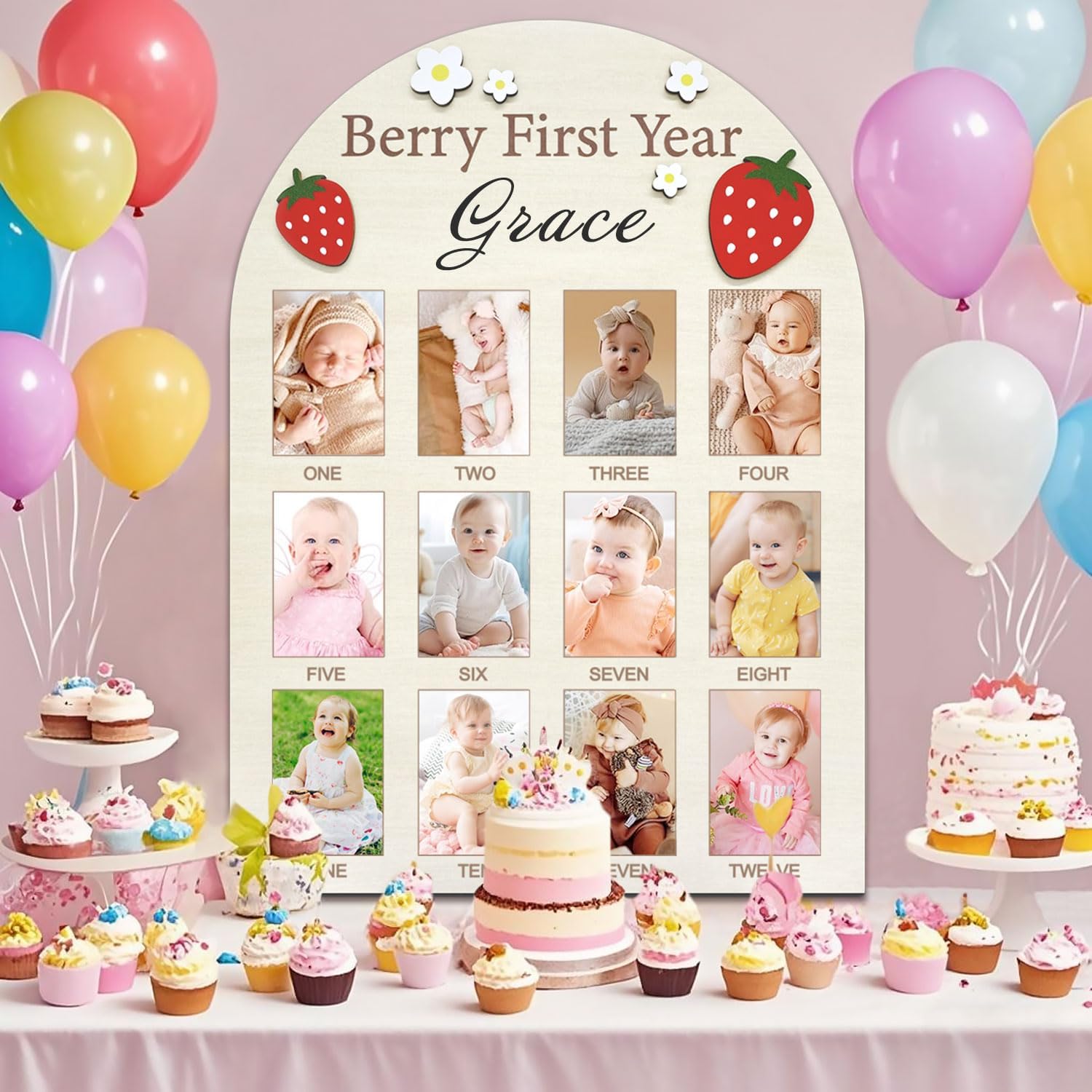 Strawberry One Year of Photo Board, Berry First Year Photo Board 12 Monthly Milestones Picture Frame for Baby Girl 1st Birthday Decorations